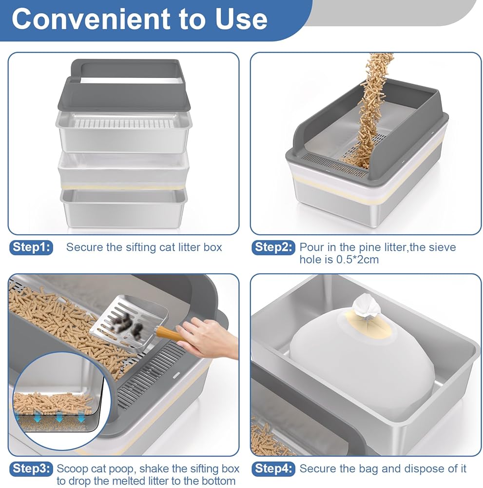 • 【بسيط لتشغيل】 تم تصميم صندوق القمامة الشبكي المعدني لصالح القمامة القطط الحبيبة الصنوبر ، مع فتحة غربال تبلغ 2 × 0.5 سم. هز المربع ، وسقع نشارة الخشب التي تشكلها الكريات الممتصة للبول إلى المقلاة السفلية. بمجرد امتلاءها ، ببساطة استبدال حقيبة القمامة