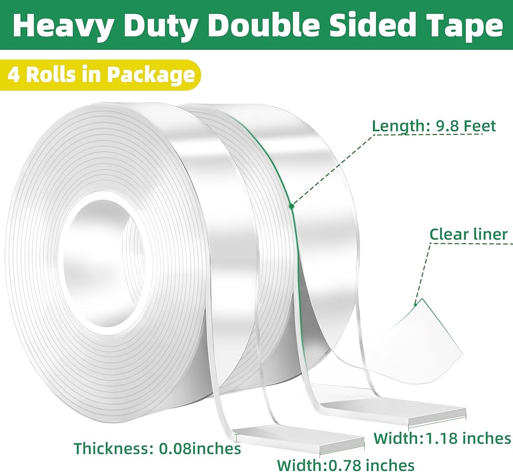 • تشمل الحزمة: 2 لفات الشريط المزدوج على الوجهين ، 9.8 قدم لكل لفة ، إجمالي 19.6 قدم. العرض: 1.18 بوصة ، سمك: 0.08 بوصة. يمكن قطع الشريط الجانبي المزدوج بأي حجم ، لذا يرجى تغطية ما يكفي شريط أو شنق الأشياء الثقيلة.