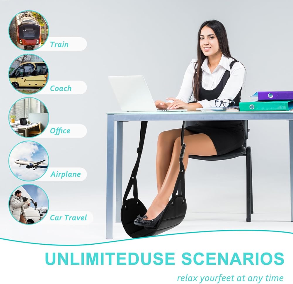 Travel Comfortably: Long flights can be a hassle, but our foot hammock for plane travel ensures your comfort. This airplane foot hammock is designed to give your feet and lower back the relaxation they deserve. Whether you're flying or working, our desk foot rest is a must-have for ultimate comfort.