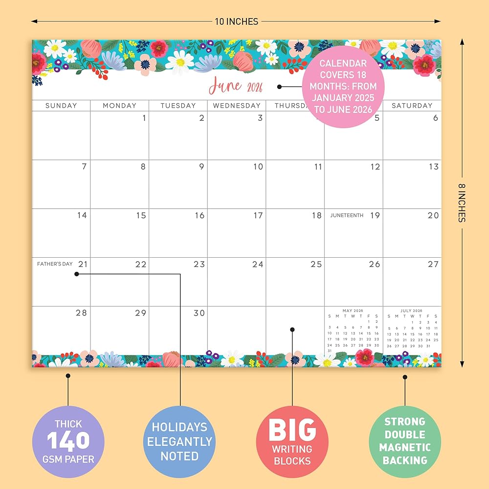 S&O FLOROL MAGNETIC SILENDAR من يناير 2025 - يونيو 2026 - تقويم الثلاجة المسيل للدموع لتتبع الأحداث والمواعيد - 18 شهرًا مخططًا مغناطيسيًا للثلاجة للتخطيط السهل - 8 "x10" في.