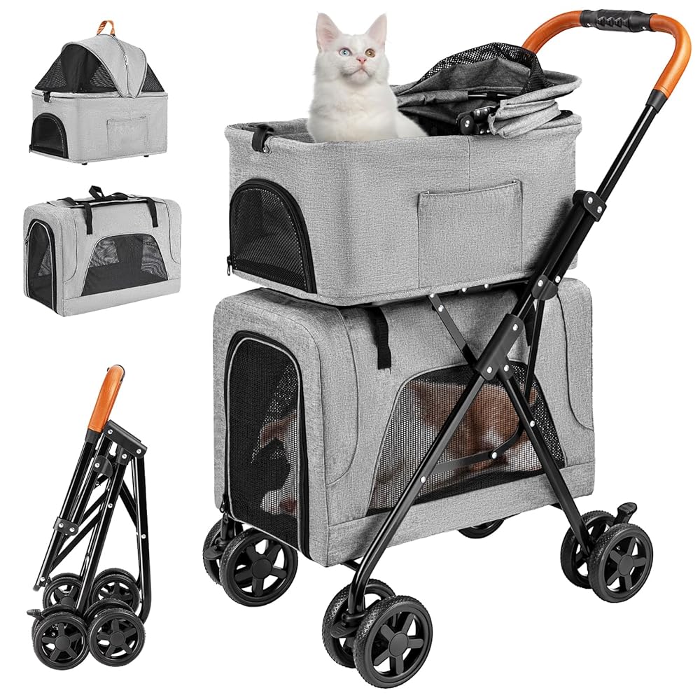 عربة مزدوجة للحيوانات الأليفة مع شركة نقل قابلة للفصل للكلاب والقطط الصغيرة المتوسطة ، ونقل سفر في عربة الأطفال خفيفة الوزن مع سلة تخزين المظلة بدون زيب بنقرة واحدة وفرامل قدم واحدة