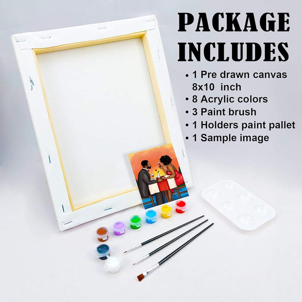 • الحزمة: 8x10 مسبقًا مسبقًا من القماش الممتد ، 8 ألوان أكريليك ، 3 فرشاة الطلاء ، البليت ، صورة عينة.