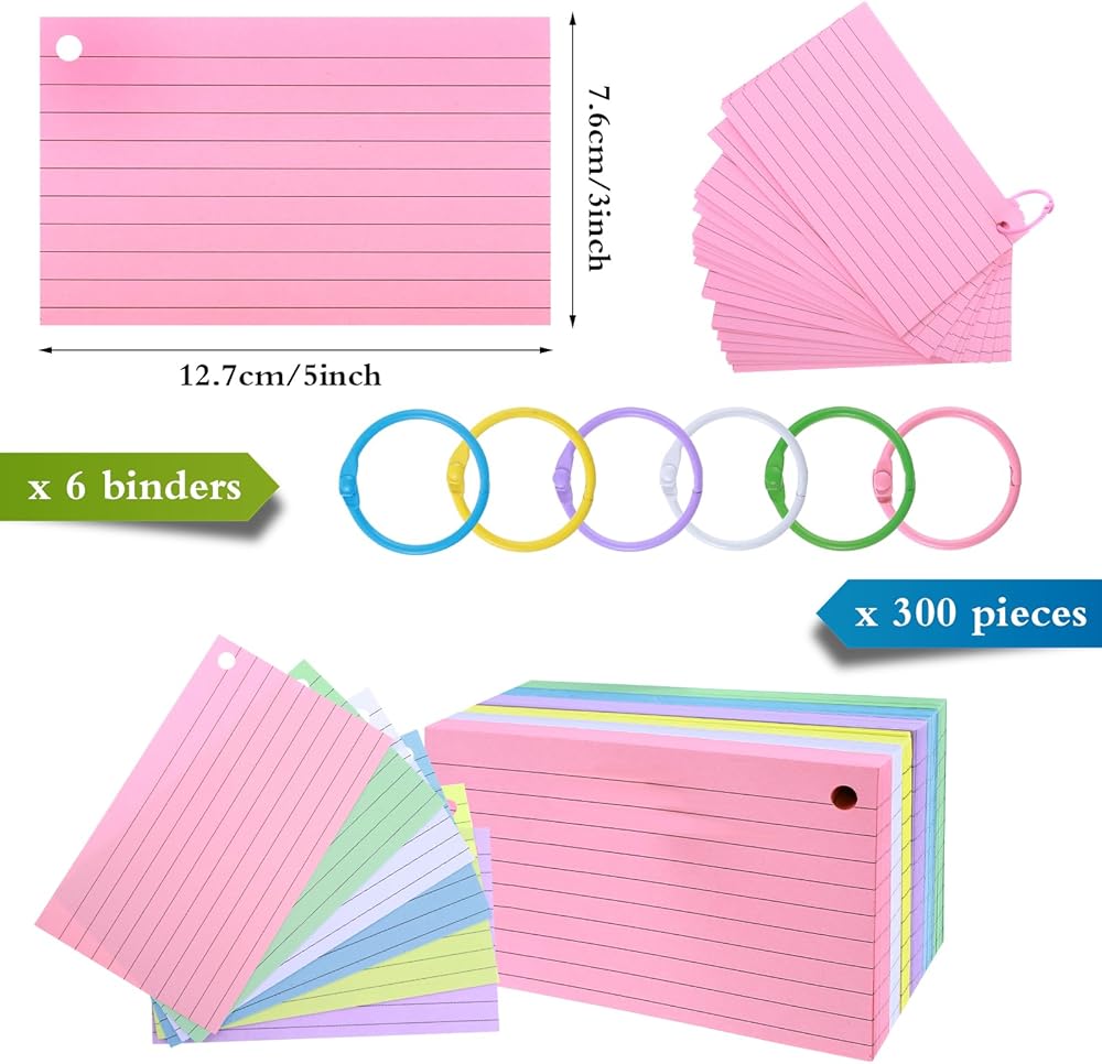 Adequate Quantity and Diverse Colors: this package consists of 300 pieces of flash cards in 6 colors, including orange, yellow, rose, blue, green and white, 50 pieces of each color; Also comes with 6 pieces of rings, so you can bind them as you like, easy to carry and write anywhere and anytime