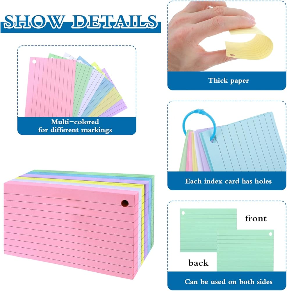 Extensive use: You can use these lined index cards to memory words, making lists and take memo, help to promote your learning, very practical and helpful. Show your care: You can send our flash cards with holes as thoughtful gifts for your family, friends, coworker, schoolmates and other who need them, you can bring them much convenience, they will be so glad to get these practical gifts.