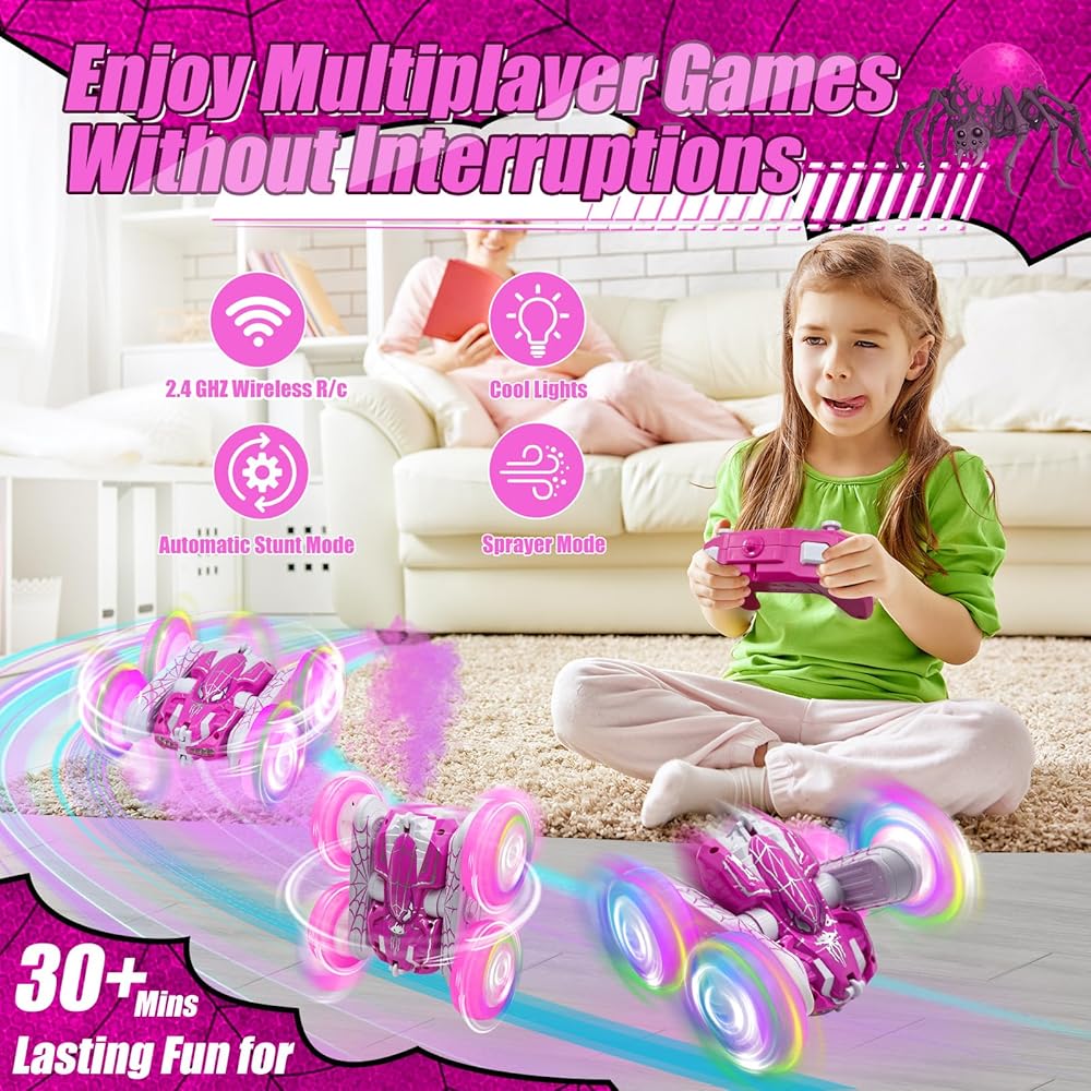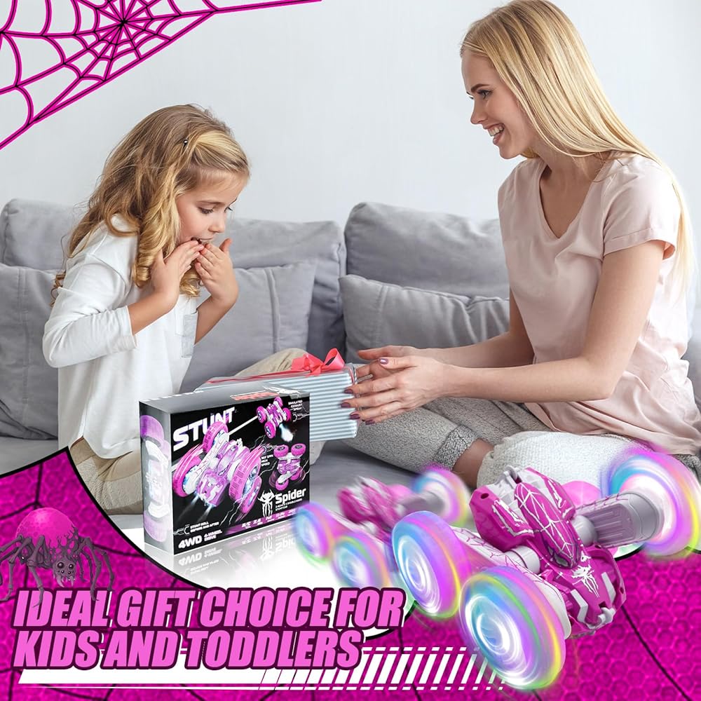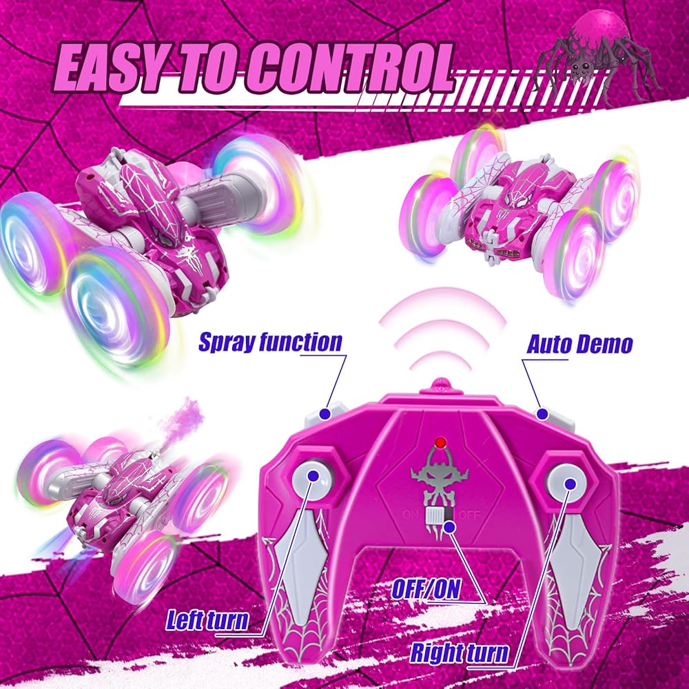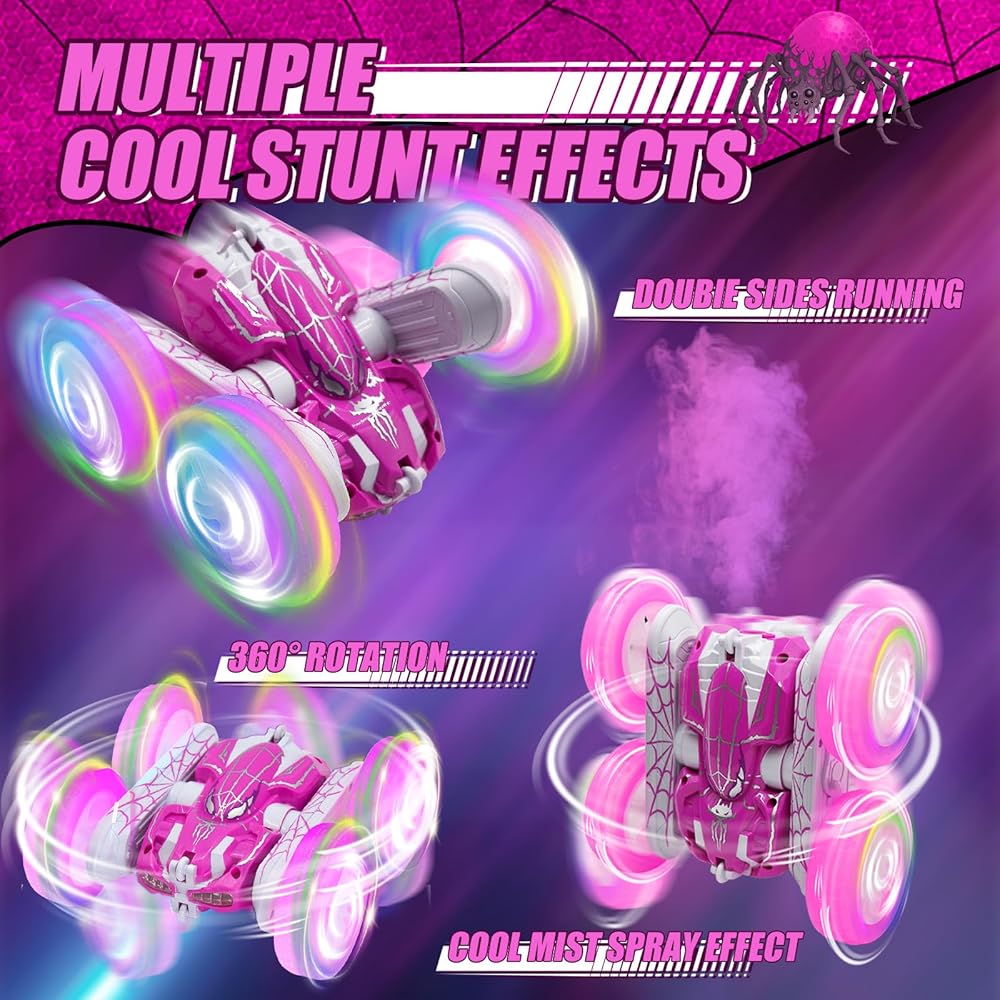 سيارة التحكم عن بُعد مع تأثير الرش وأضواء بارد LED ، 360 درجة من الوجهين 2.4 جيجا هرتز 4WD جميع التضاريس خارج الطريق عنكبوت RC CAR لأطفال ، ألعاب RC Stunt Car ، سيارة سباق كهربائية لـ 4+ فتيات الفتيات (الوردي)