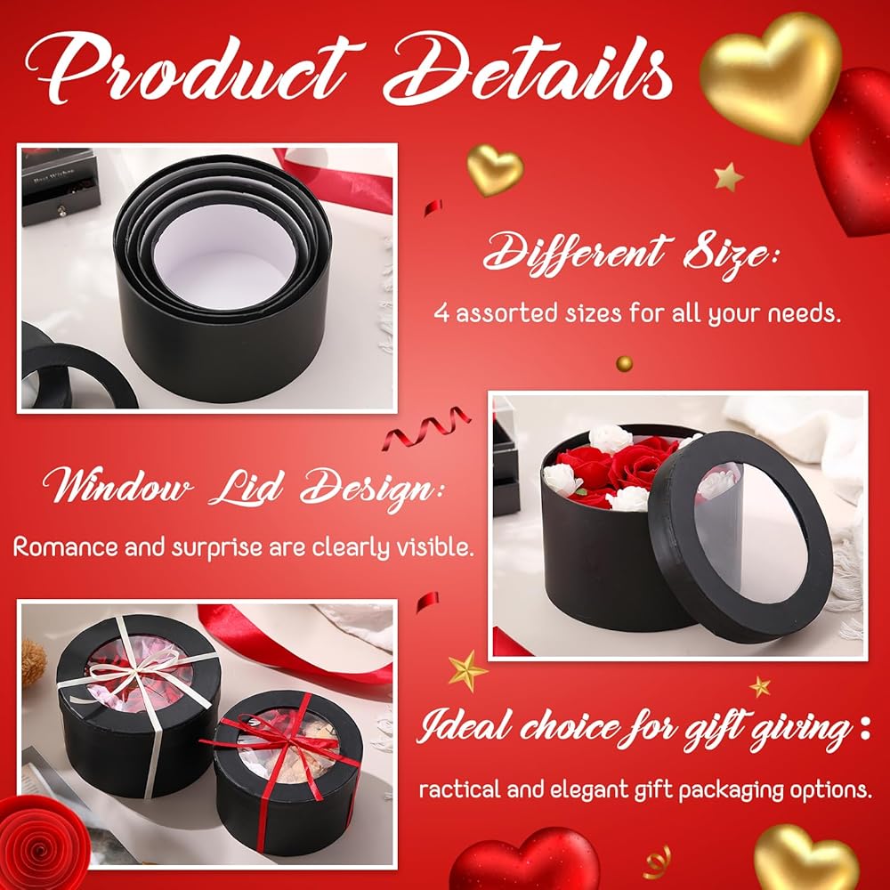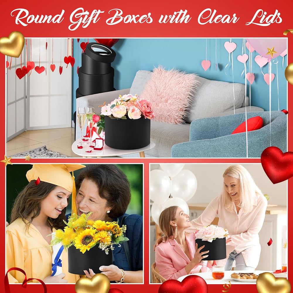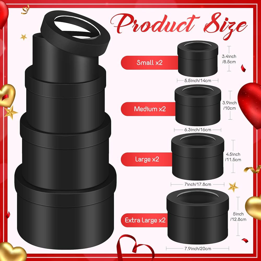 مجموعة من 8 صناديق زهرة مستديرة مع أغطية واضحة 4 صناديق هدايا متنوعة لأحجام لترتيبات الزهور مربع هدايا جولة هدية للهدية عيد ميلاد عيد الأم يوم الزفاف (أسود)