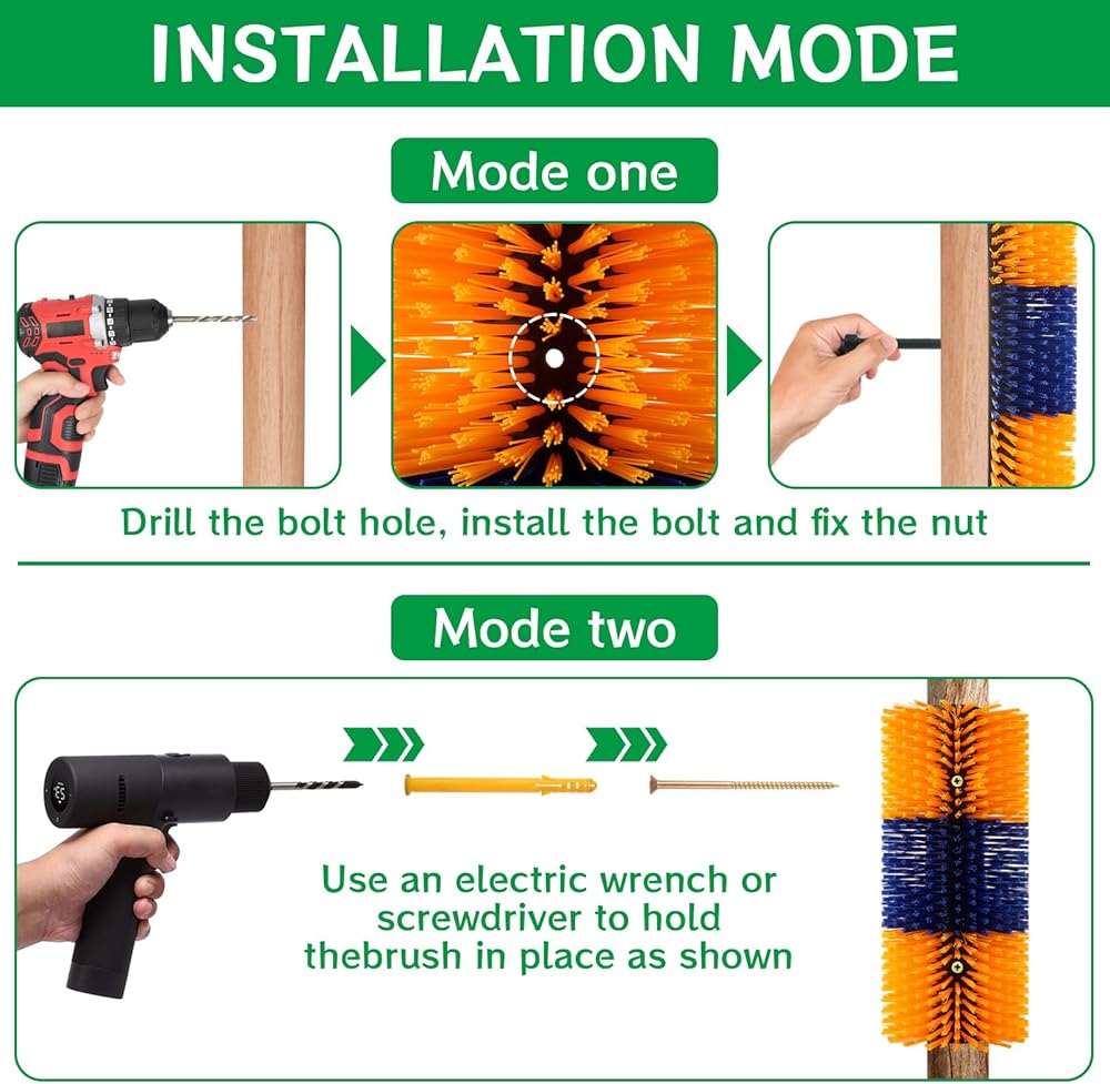 The livestock scratching brush can be installed easily on tree stumps, fence posts, and other suitable places, to prevent livestock from rubbing against valuable fences, equipment, or buildings