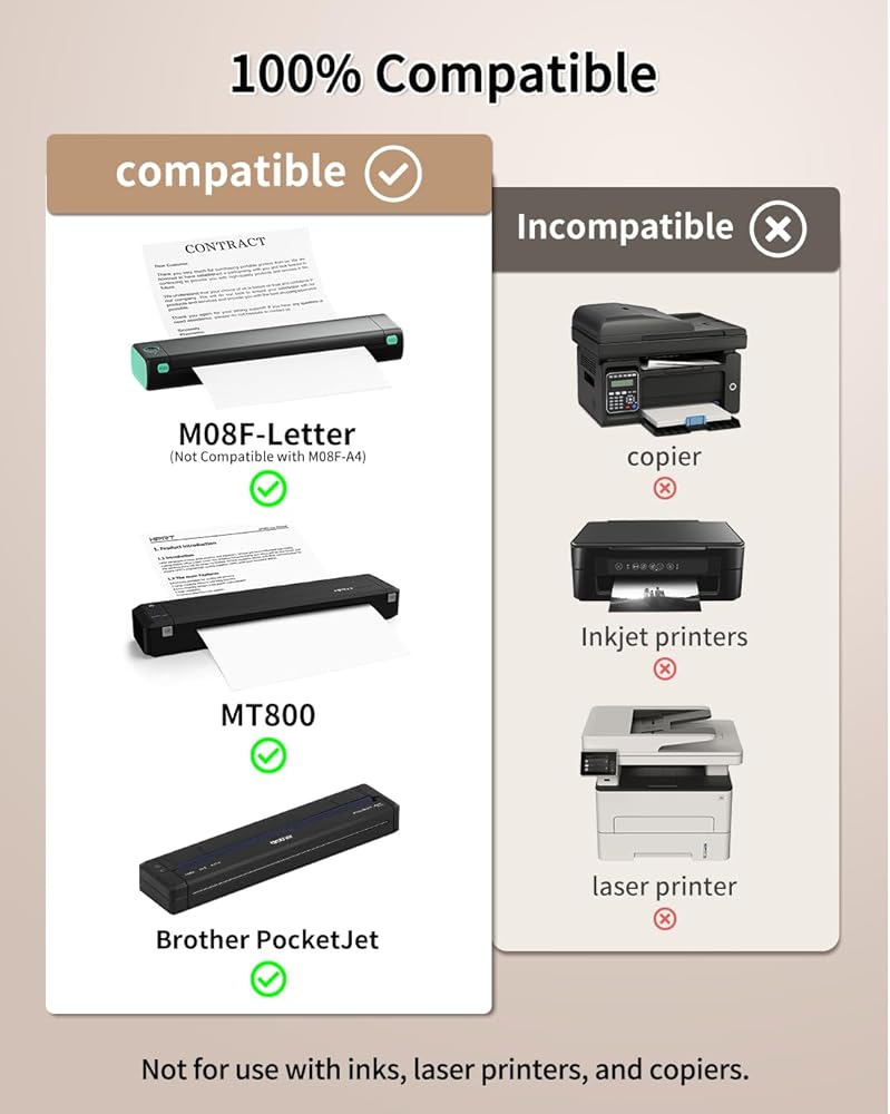 متوافق 100 ٪: مناسبة لمختلف الطابعات المحمولة. قم بتوفير خطاب الولايات المتحدة الحراري الأصلي ، متوافق مع Phomemo ، Itari ، Colorwing ، Odaro) M08F ، M832 ، M833 ، M834 ، MT800 ، MT800Q وغيرها من الطابعات الحرارية الحرفية. بالمقارنة مع العلامات التجارية الأخرى من الورق الثري المتوافق ، فإن المطبوعات الورقية الثابتة أكثر وضوحًا وأفضل مظهرها وأكثر متانة. (ملاحظة: ورقة الطابعة الحرارية غير متوافقة مع طابعات الليزر/طابعات/حبر/نسخ.)