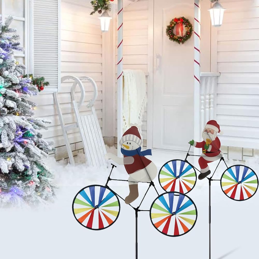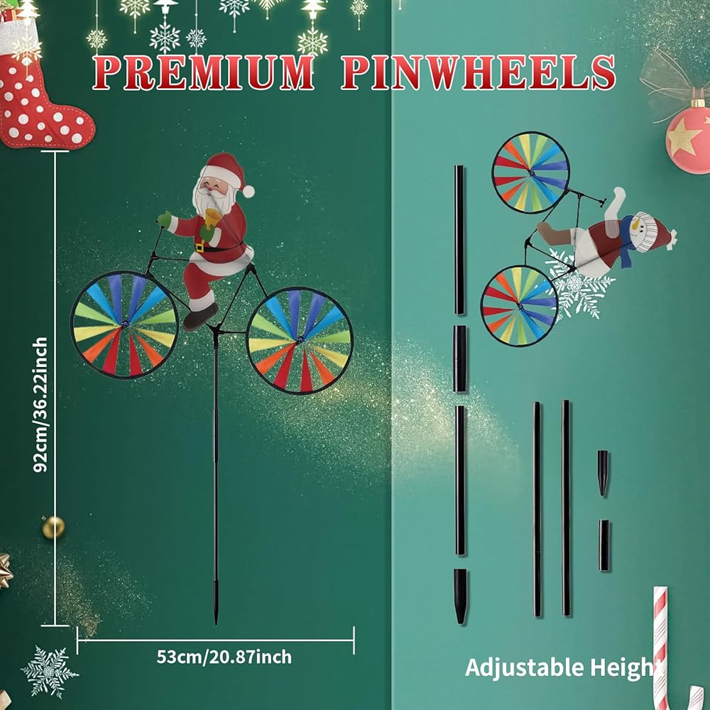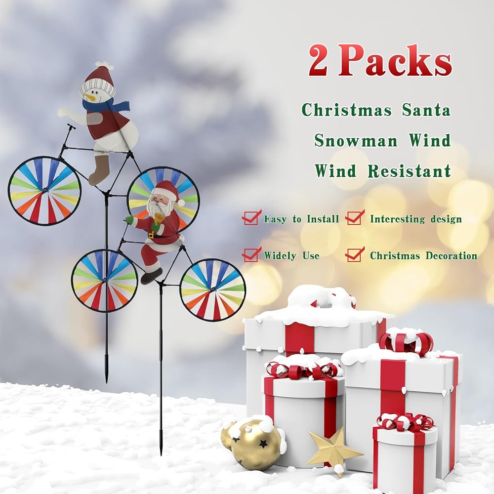 2 حزمة 20 بوصة عيد الميلاد سانتا وثلوج الدراجة زخارف الدوار الدوار مع المخاطر مع طاحونة طاحونة المغازل في الهواء الطلق لليارد حديقة الحديقة ، عجلات كبيرة دبوسة إكسسوارات عيد الميلاد هدايا للأطفال