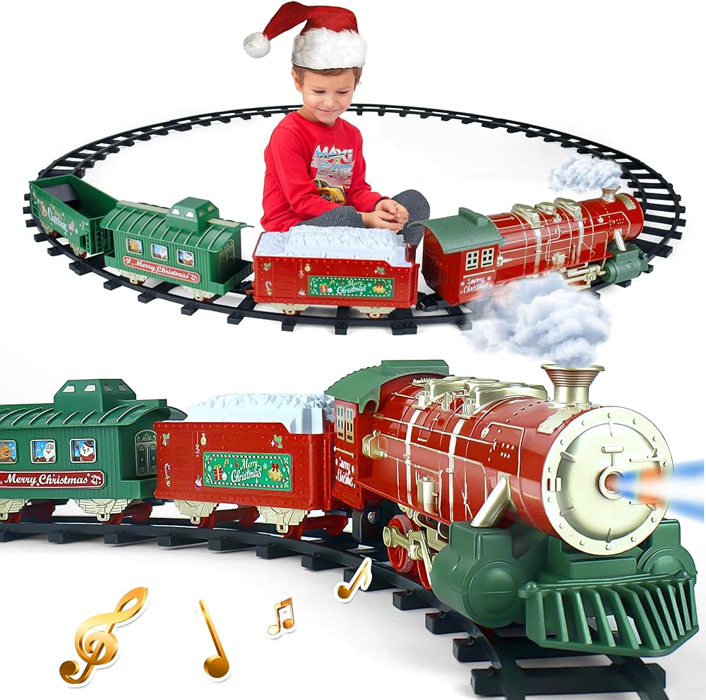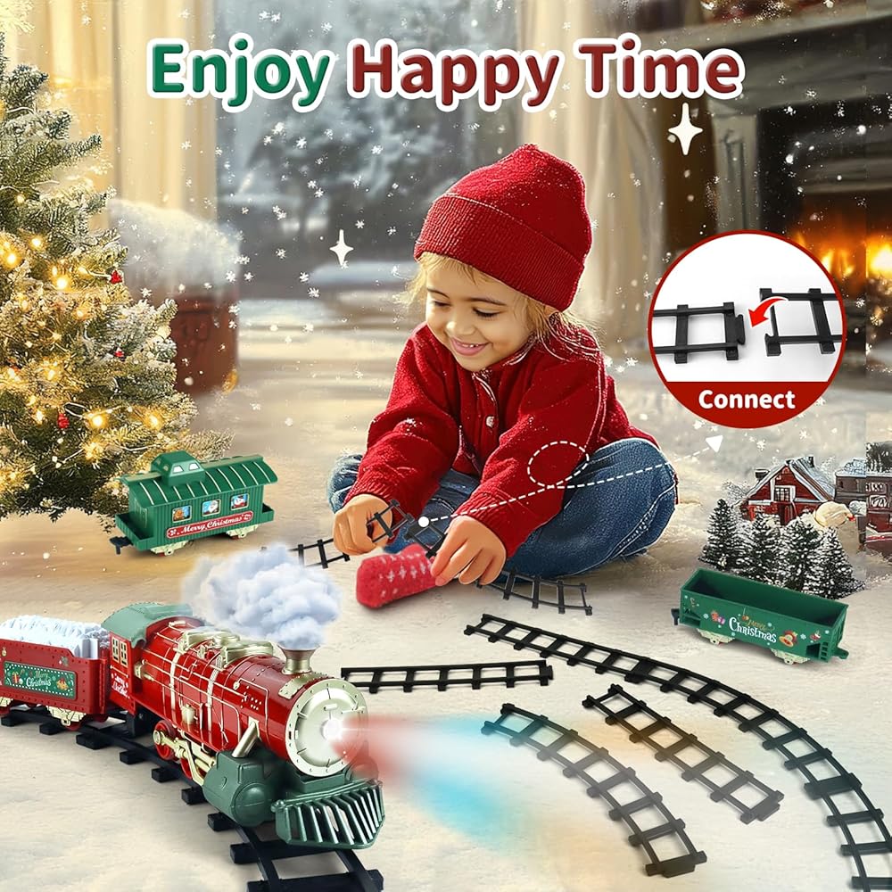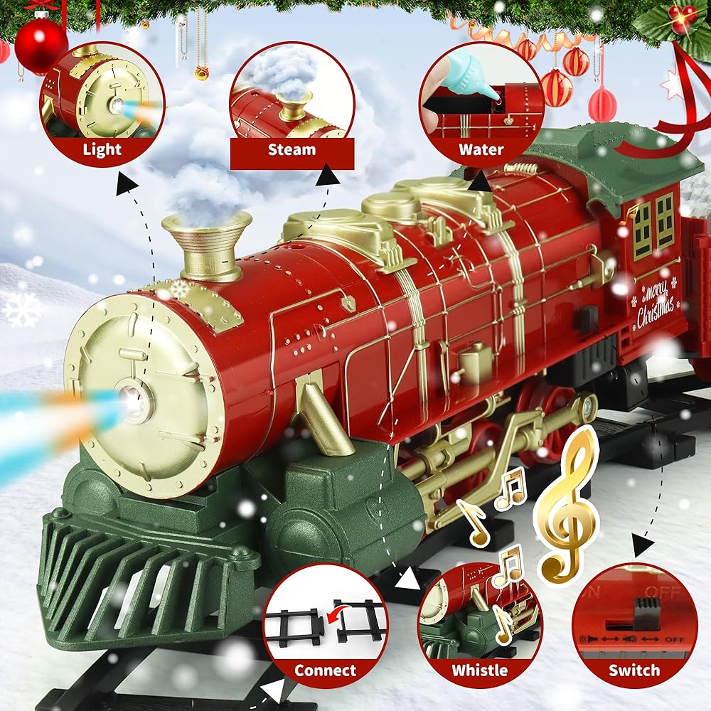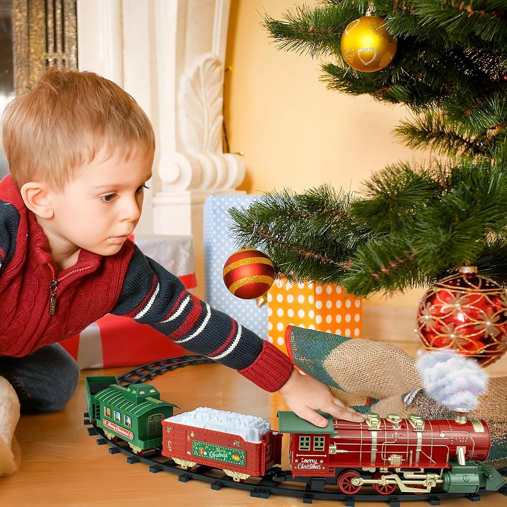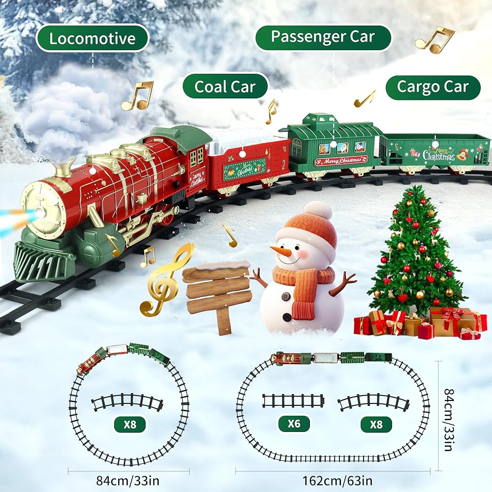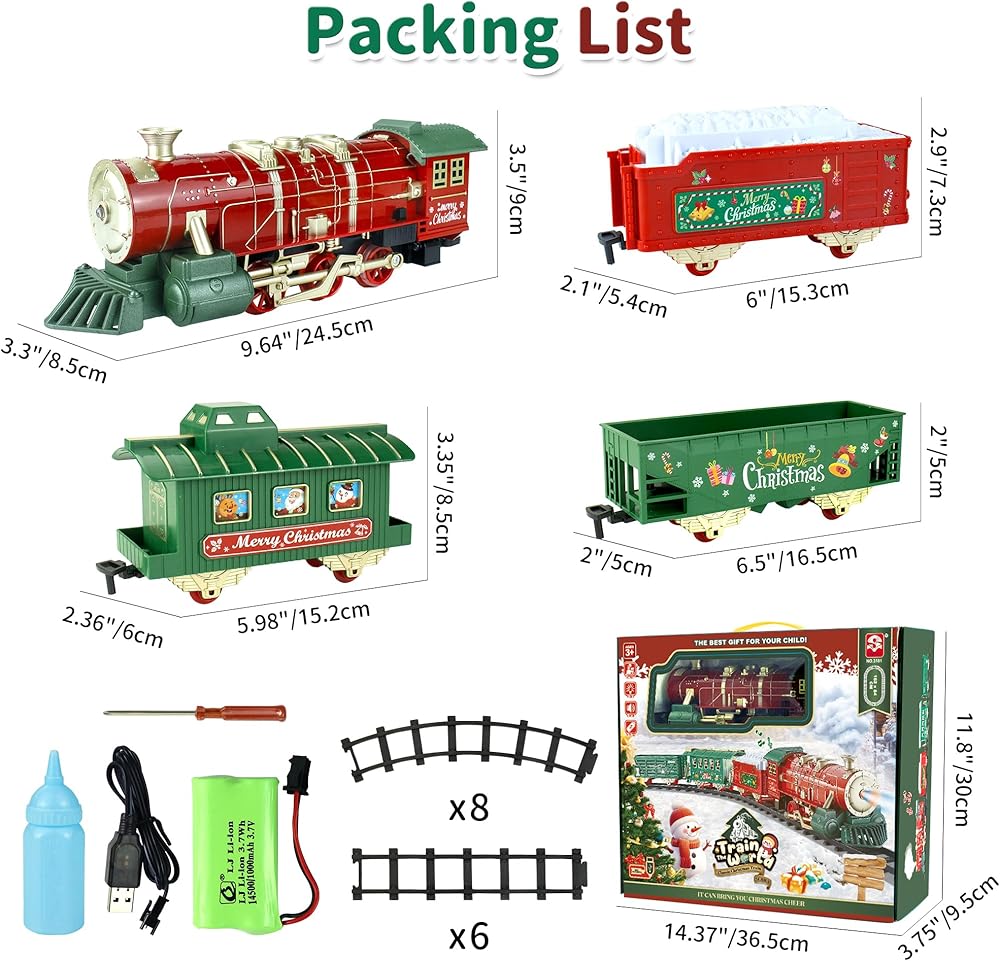 • مجموعة قطار عيد الميلاد الكلاسيكية: قاطرة البخار الكلاسيكية مع سيارة الفحم وسيارة الركاب وسيارات الشحن تقود حول شجرة عيد الميلاد. مع 6 بطاريات فقط (غير مدرجة) ، يمكنك بدء رحلة قطار فريدة من نوعها والاستمتاع بقطار البخار الساحر مع عائلتك!