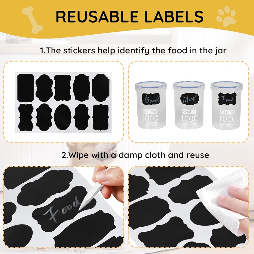 وضع العلامات القابلة للتخصيص : استخدم العلامة المضمنة لكتابة اسم الكلب أو نوع العلاج على الملصقات القابلة لإعادة الاستخدام. يمكن محو هذه الملصقات بسهولة وإعادة كتابتها ، مما يسمح بالمرونة والفوضى
