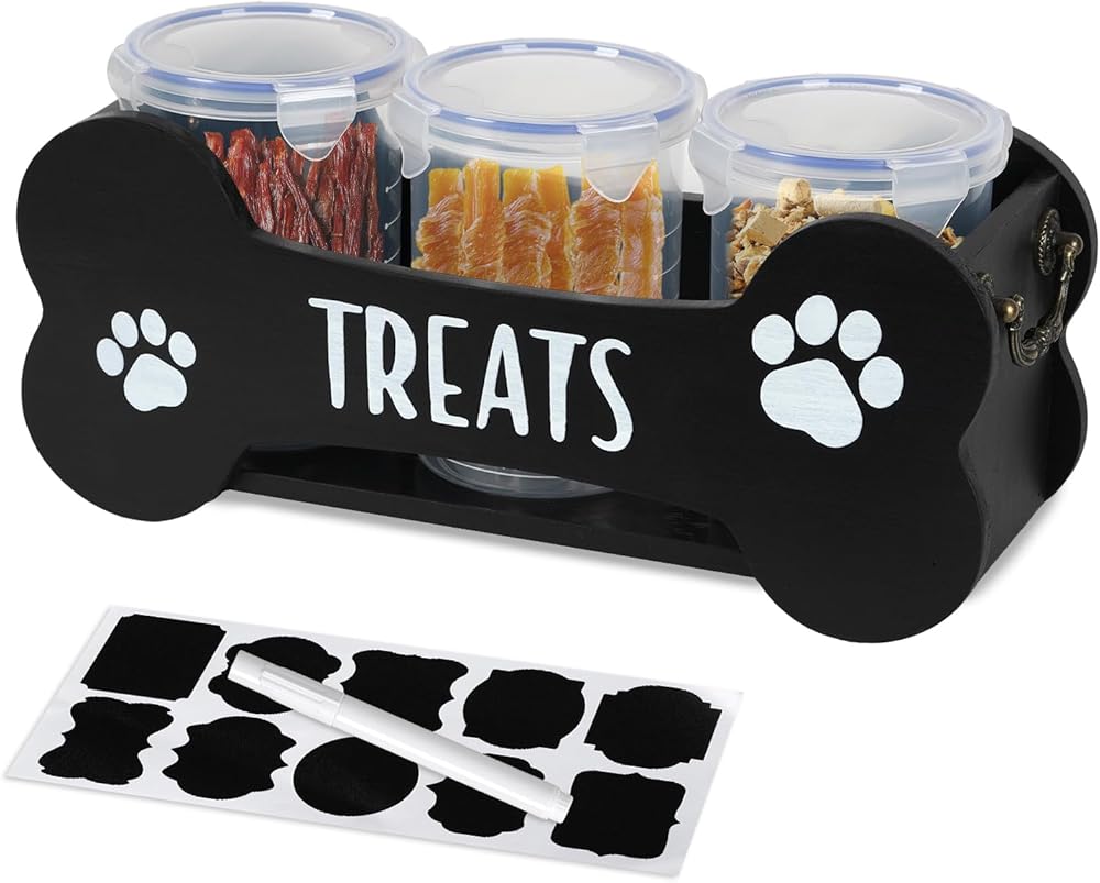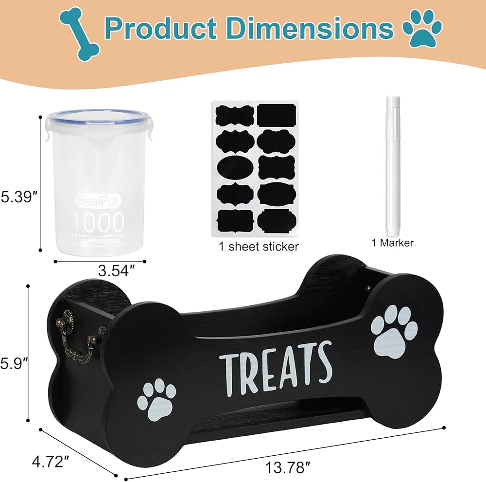حاوية معالجة الكلاب : تشتمل حاوية تخزين طعام الكلب هذه على رف خشبي ، ومربانيات محكمة الإغلاق 3 × 1000 مل ، وعلامة ، وورقة من الملصقات. إنه حل واحد - توقف لتنظيم الوجبات الخفيفة لكلبك بدقة