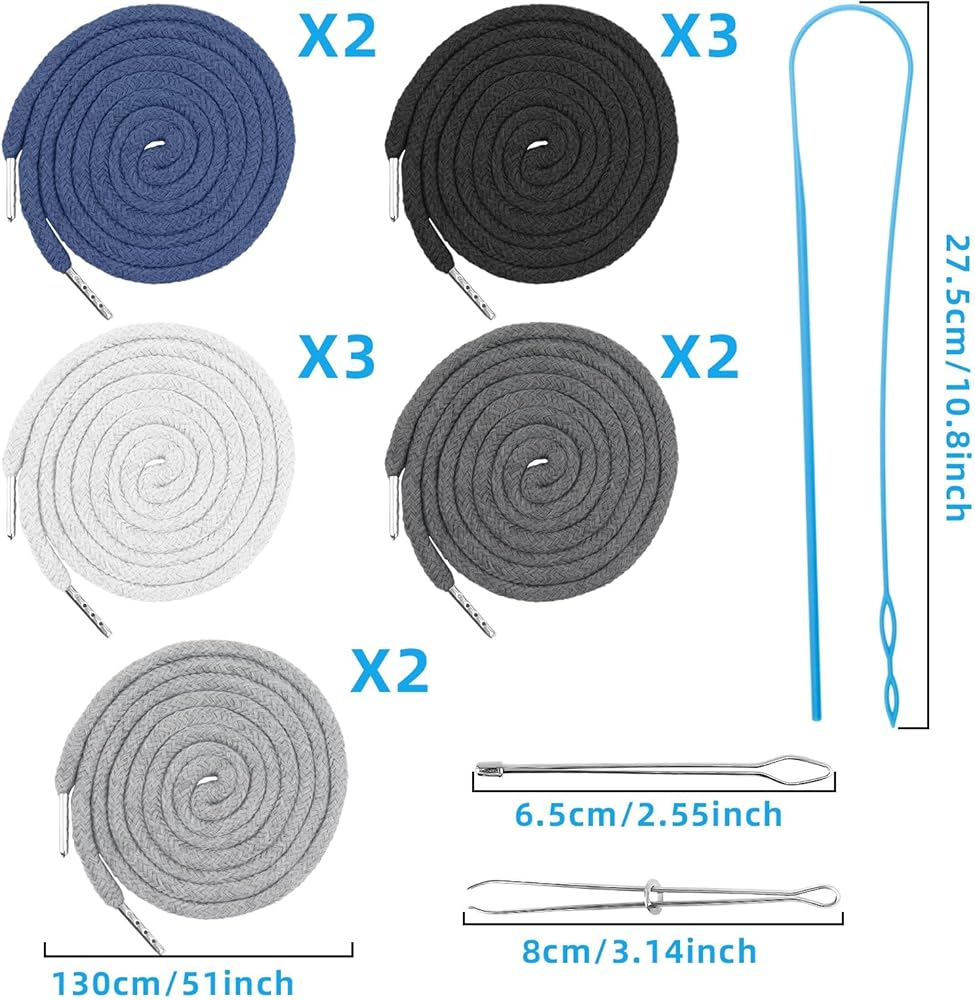 This comprehensive set includes 12PCS 51 Inch Length Replacement Drawstrings for Shorts/Sweatpants/Hoodie-String, providing versatile options for various garments. With 3PCS Drawstring Threader Tool Set included, replacing drawstrings becomes effortless and efficient.