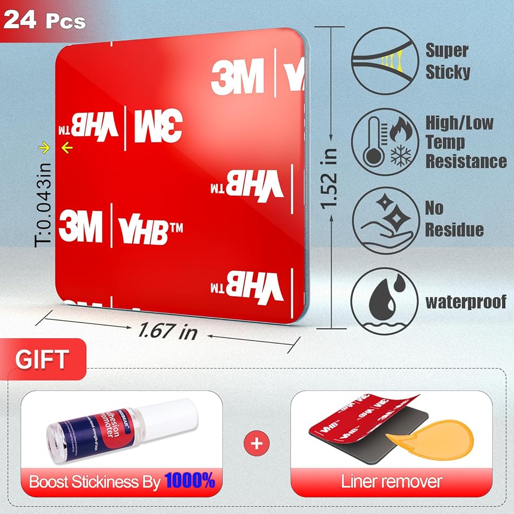 الشريط الشاق المربع الشديد 1.52 × 1.67 بوصة ، مصنوع من 3 أمتار VHB ، وسادة شريطية مقابلة للتركيب ، مناسبة لحاملي الهواتف المحمولة ، وتثبيت CAR DVR ، 24 جهاز كمبيوتر الشخصي
