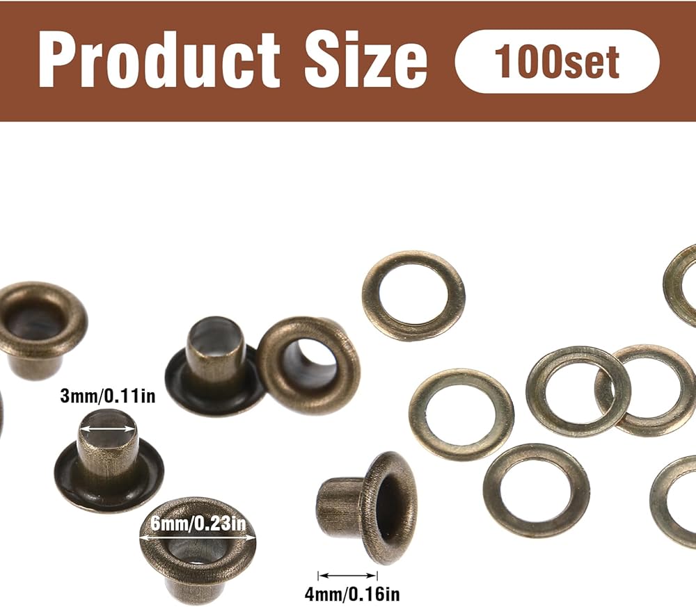 【Package Content】You will get 100 sets of eyelet and grommet tools, the size is: inner diameter 3mm/0.11in, outer diameter: 6mm/0.23in, height: 4mm/0.16in. Sufficient quantity will meet your use needs.