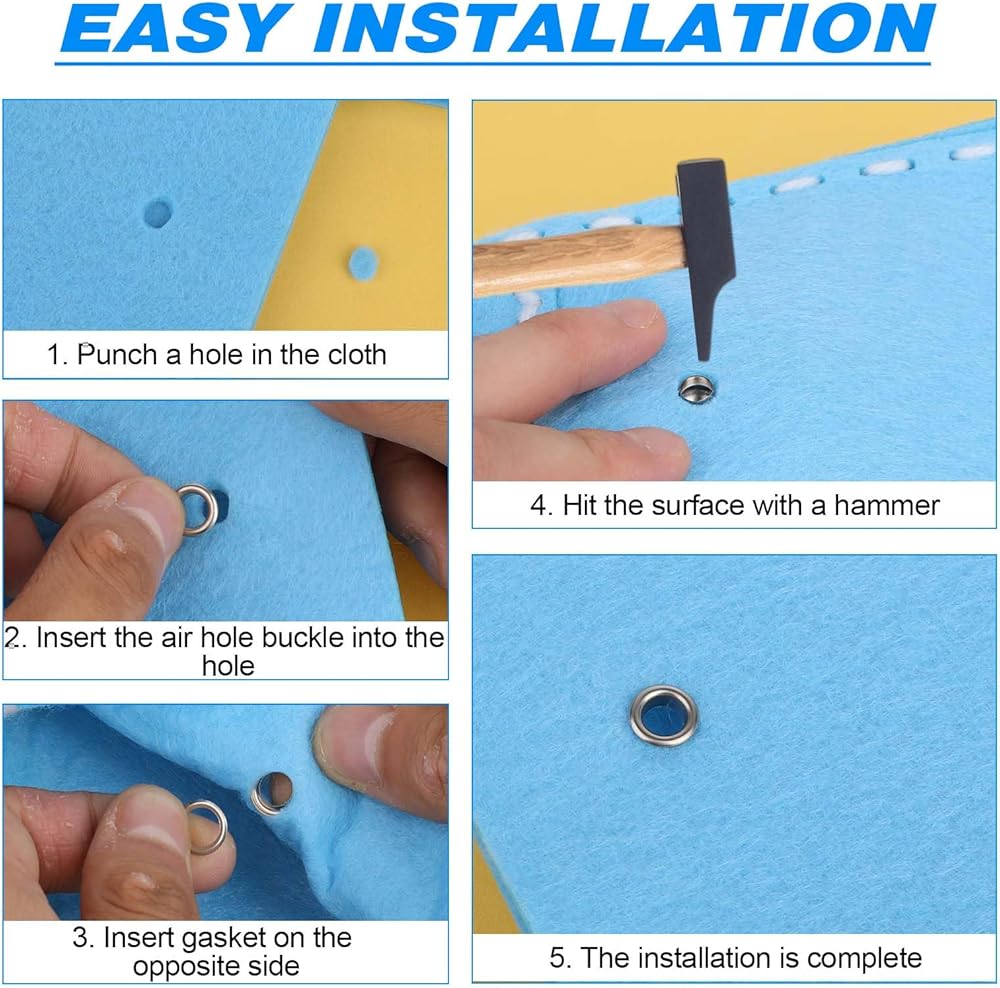 【Easy to Use】You need to punch a hole, then pass the eyelet through the hole on the front of the object, set the washer on the back of the hole, and finally tap it with a unique tool to install.