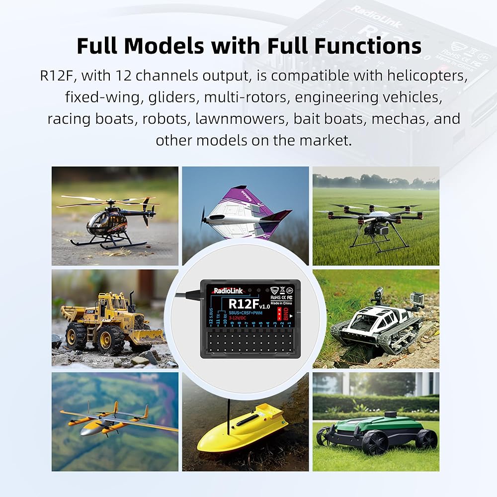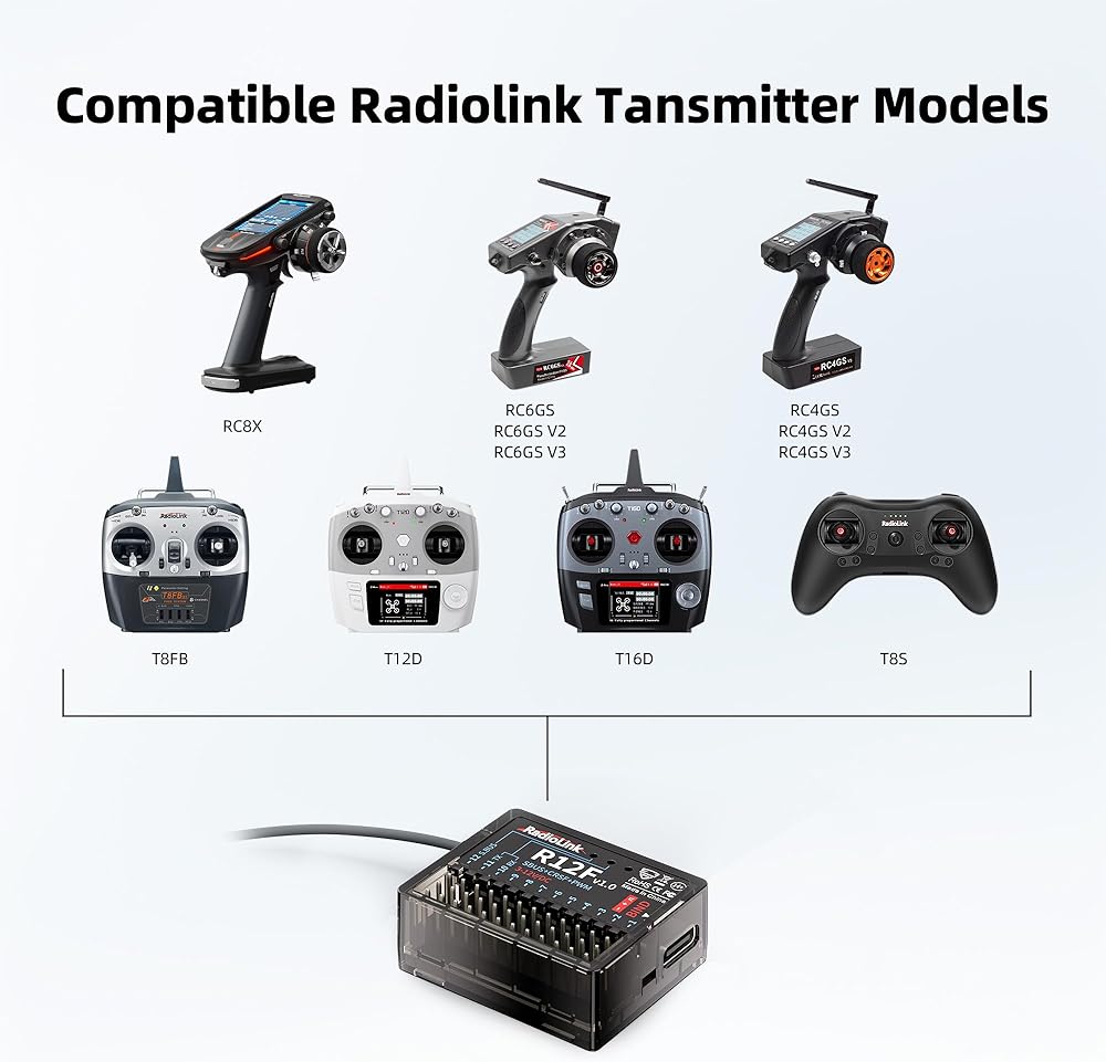 【التوافق العالي】-يعتبر جهاز استقبال R12F مثاليًا للطائرات الهليكوبتر ، والضوابط الثابتة ، والزجاجات ، والمرورات المتعددة ، والمركبات الهندسية ، وقوارب السباقات ، والروبوتات ، والمروجات ، والقوارب الطعم ، وغيرها من الطرز في السوق. متوافق مع أجهزة إرسال radiolink: T12D/T16D/RC8X/RC6GS V3/RC4GS V3/T8FB/T8S.