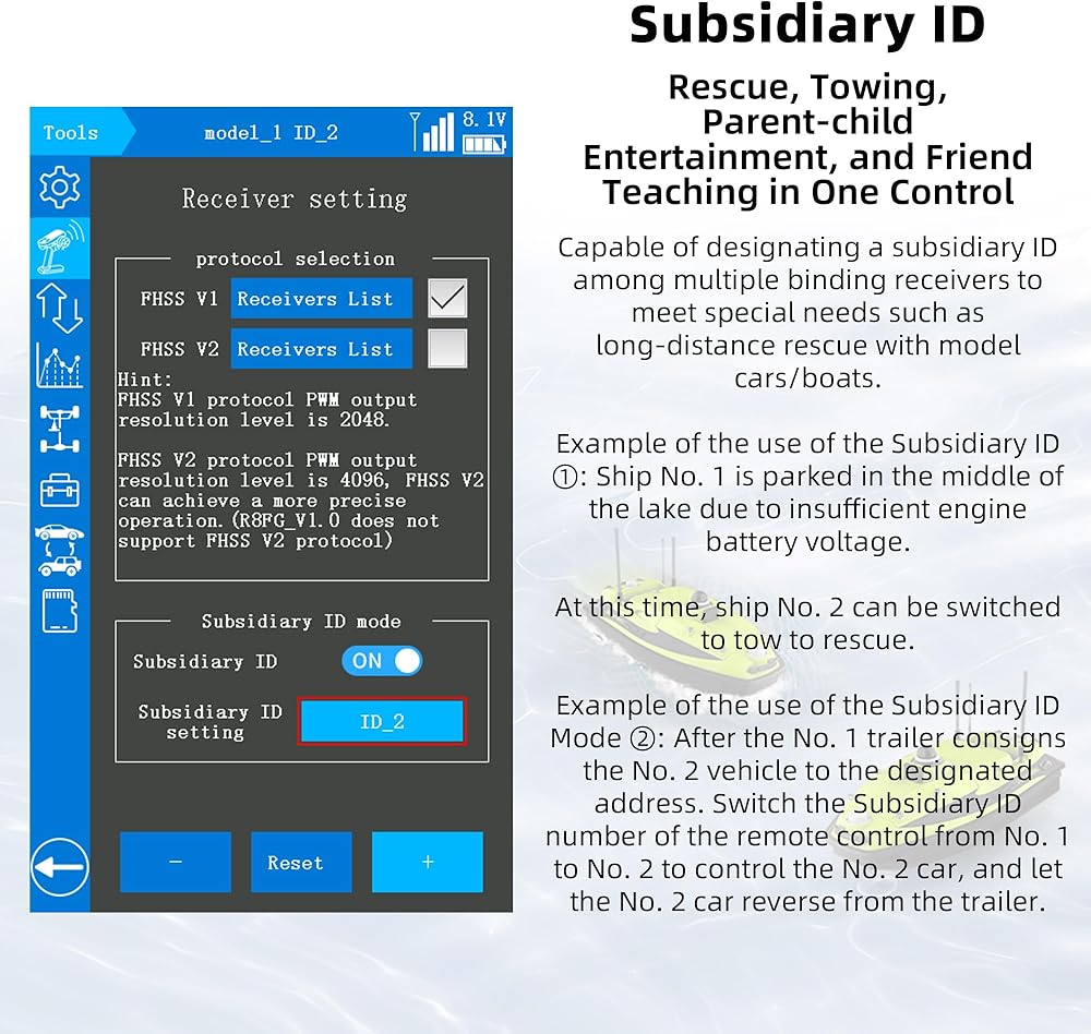 【ID الفرعية】- قادرة على تعيين معرف فرعي بين أجهزة الاستقبال المتعددة الملزمة لتلبية الاحتياجات الخاصة مثل الإنقاذ لمسافات طويلة مع السيارات/القوارب النموذجية.