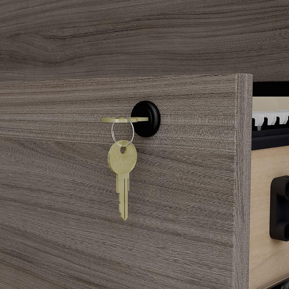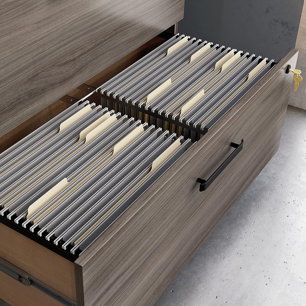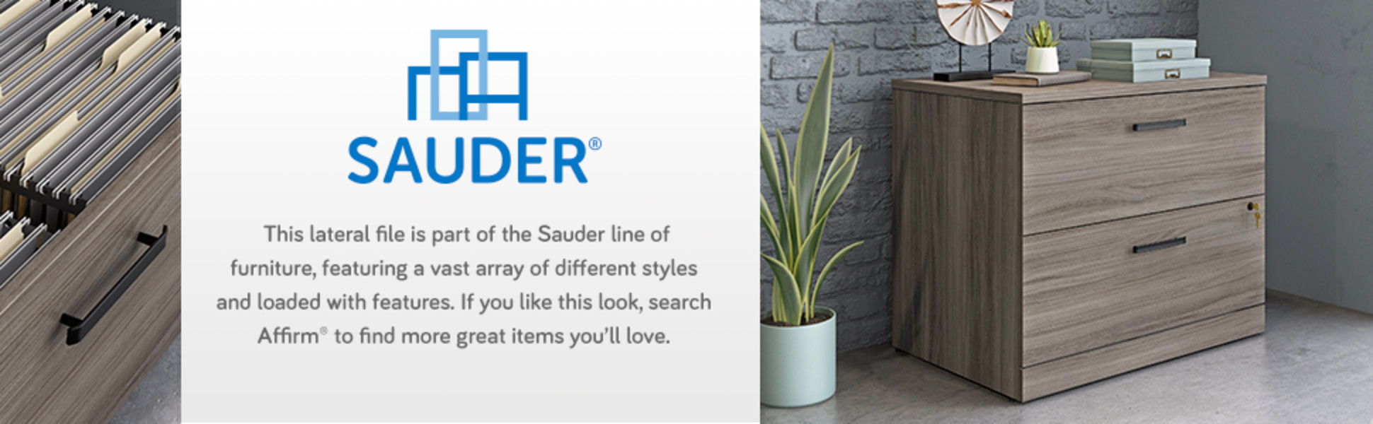 Find all the file space you need with this file cabinet from the Affirm® collection. This 2-drawer lateral file cabinet comes fully assembled, with minimal hardware attachment required so you can spend less time assembling and more time organizing. This commercial filing cabinet features a durable, 1" thick top with enough room for books, office décor, and a lamp. This lateral filing cabinet includes a melamine top surface that is heat, stain, and scratch resistant. Two drawers with full extension sides hold letter, legal, or European size hanging files. This lateral file includes an interlocking safety mechanism that allows only one drawer to open at a time. You can guarantee the security of your most important documents with a key lock on this two-drawer lateral filing cabinet. Commercial filing cabinets that are finished on all sides, like this one, allow for versatile placement and a polished look from every angle. Adjustable levelers at the base of this commercial office furniture provide precision and customization no matter how you arrange your office. Finished in Hudson Elm™, this file cabinet offers storage space for the most intense file hoarders.