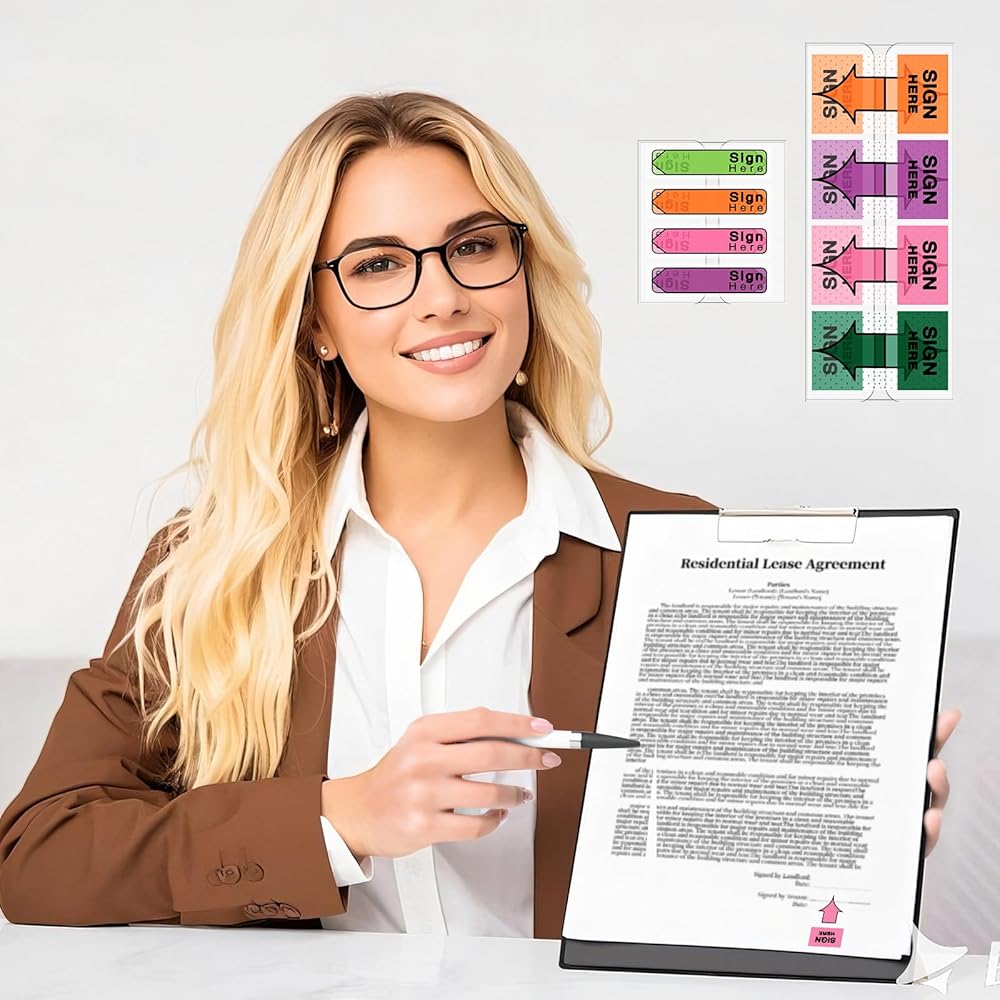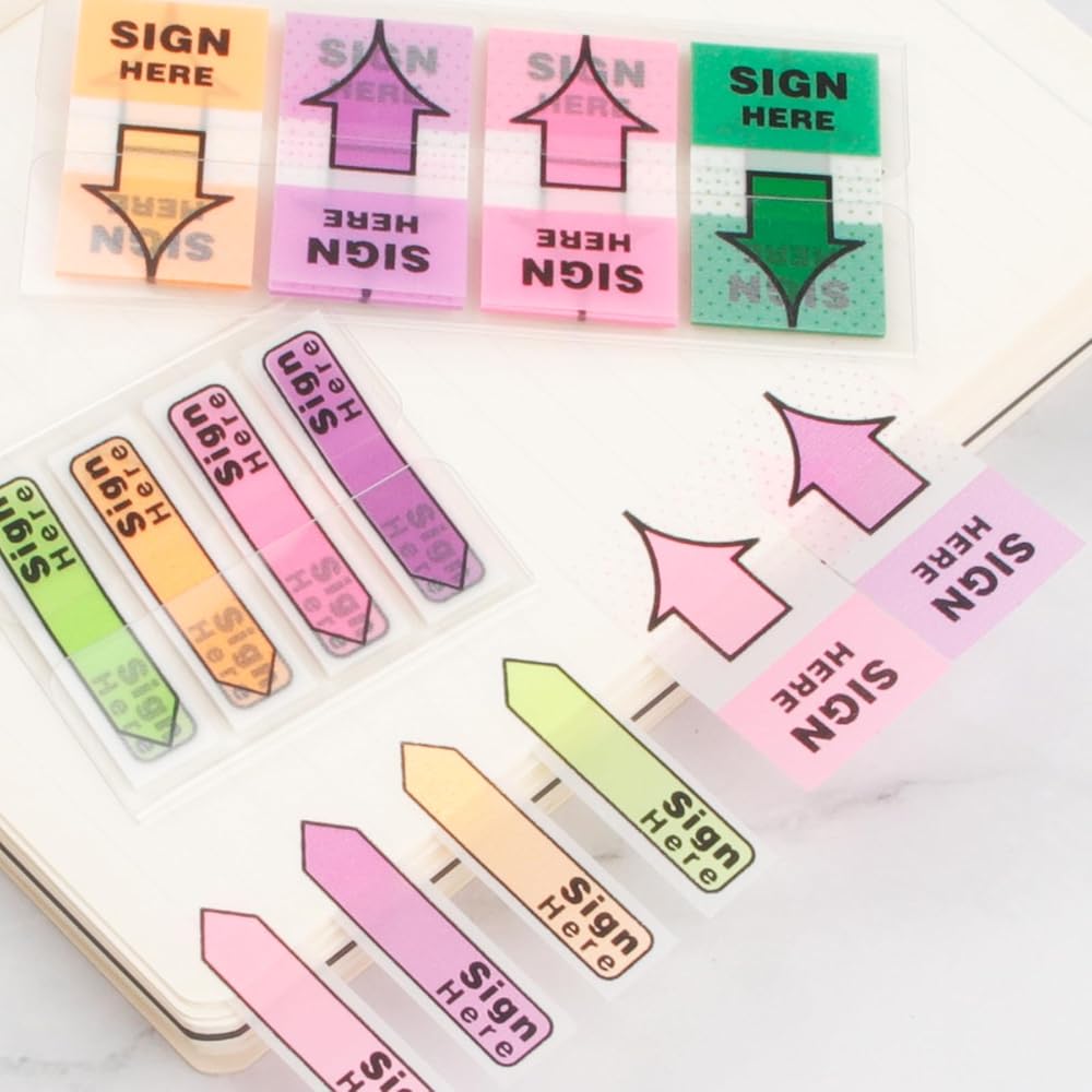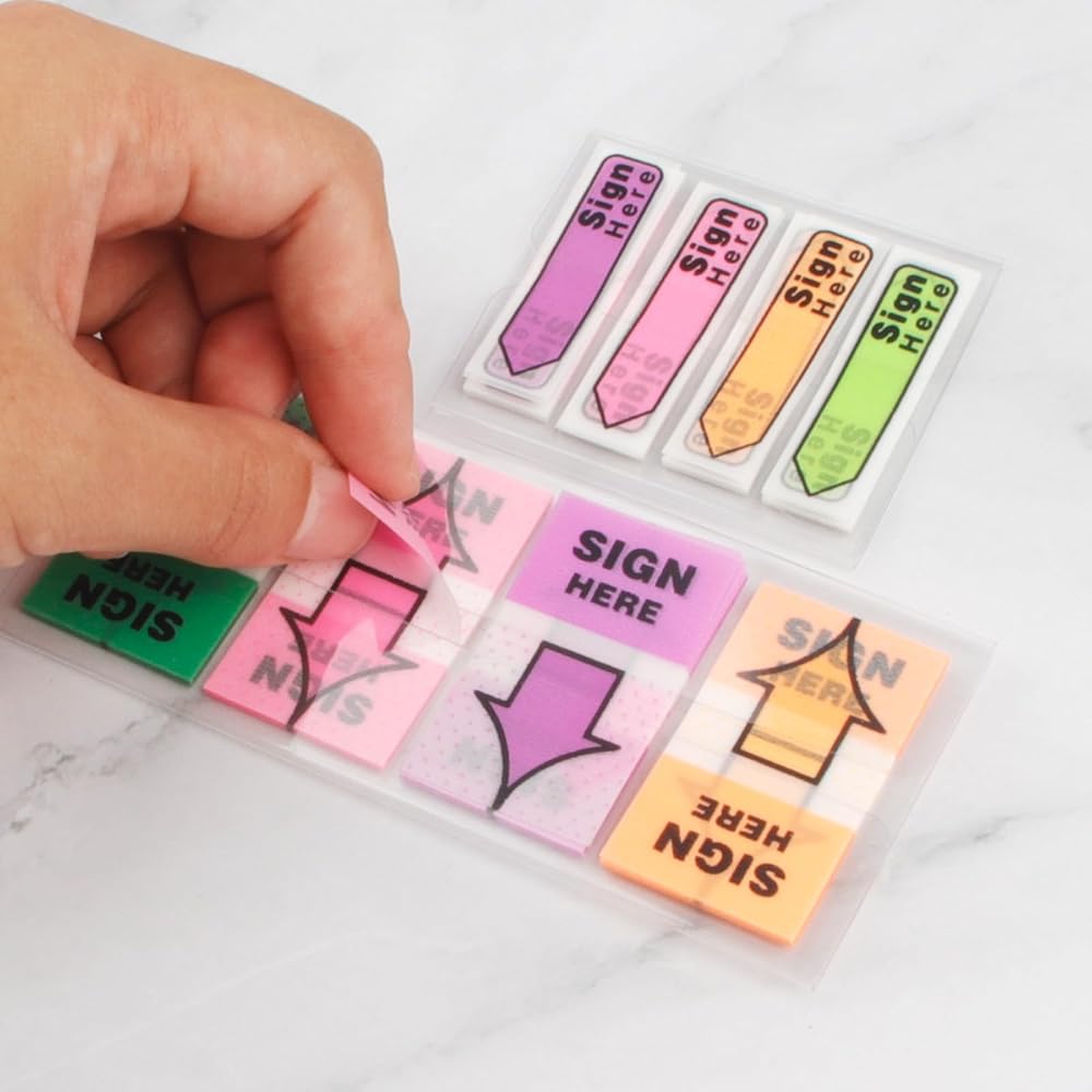 • Durable and Reliable Adhesion: Our Signature Sticky Tabs are made with a strong adhesive that ensures they remain firmly in place on various document surfaces, even with frequent handling. This reliability is crucial for maintaining the organization and integrity of your documents, ensuring that your sign here flags stay put until they are intentionally removed.