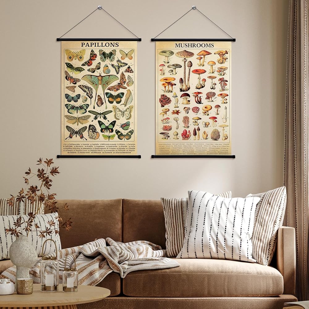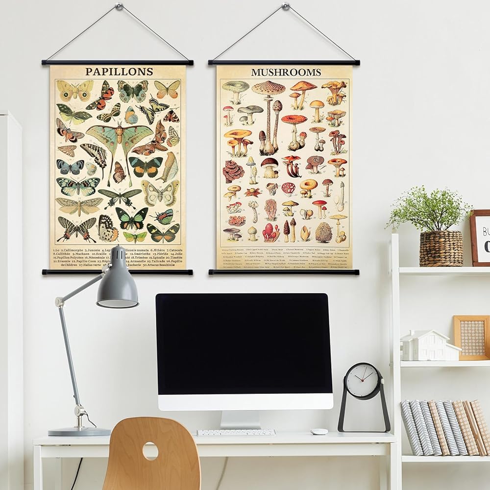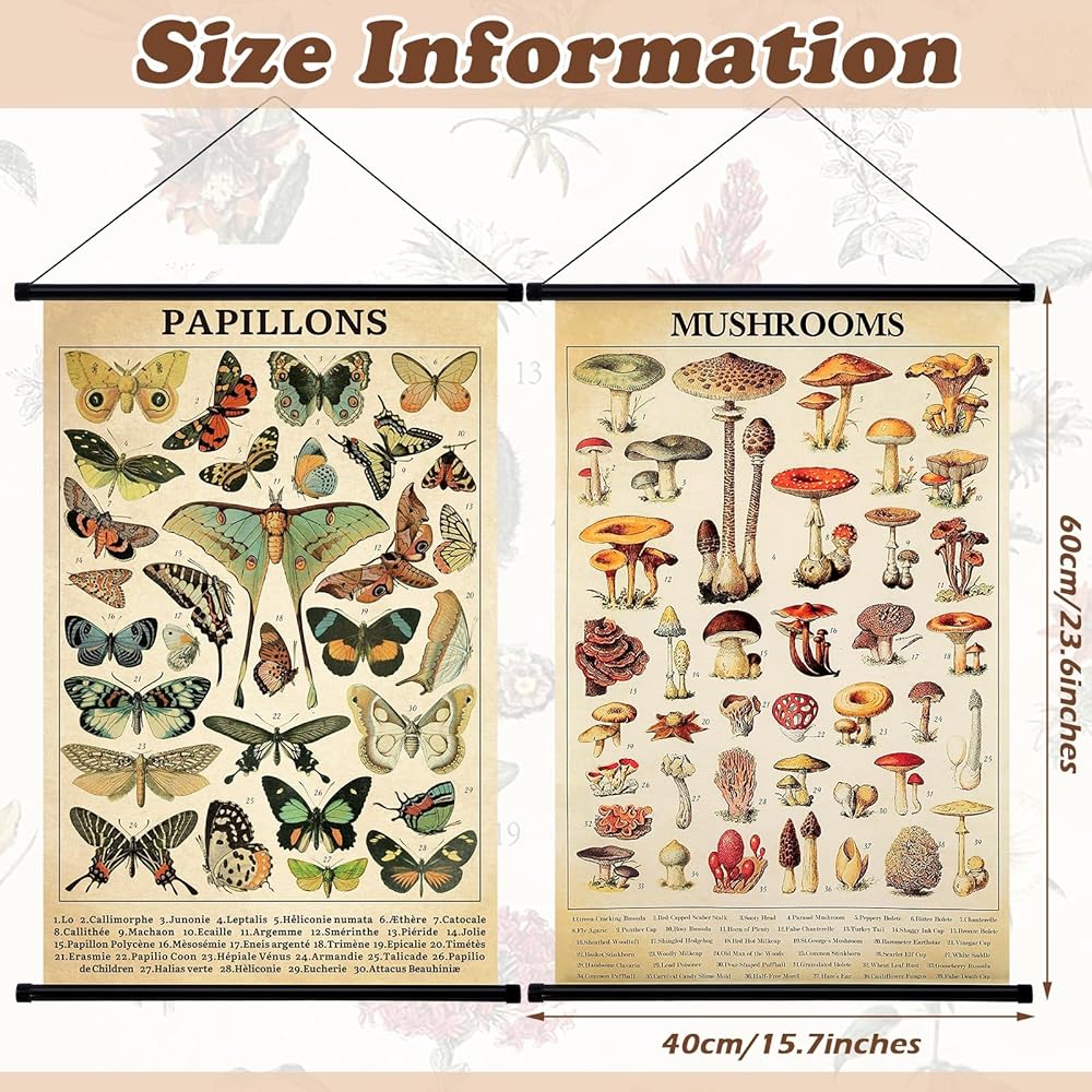 Lewtemi 2 PCS عتيقة الفطر زهرة الملصق الفطريات الفطريات الجدار الريفي معلقة ملصق مخطط مرجعي توضيحي لغرفة غرفة المعيشة ، 15.4 × 23.6 بوصة (الفطر ، الفراشة)