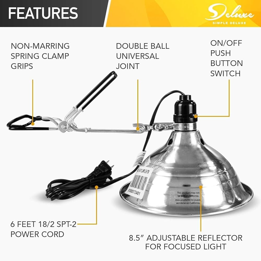 Simple Deluxe clamp lamp socket with detachable 8.5-inch aluminum reflector, good build and has an on/off switch. The clamp is sturdy, easy to move around and position as well.