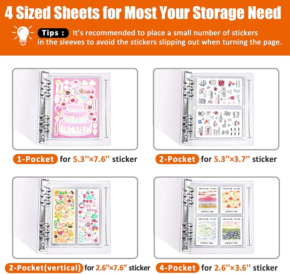 سعة كبيرة: يحتوي كتاب جمع الملصقات على 45 أكمامًا (185 جيوبًا) في 5 أحجام مختلفة ، والتي يمكن أن تناسب ملصقات مختلفة. يمكن أن تحتوي الجيوب المختومة على zipless على ملصقات متعددة متناثرة ويمكن أن تساعد الأكمام في فرز مجموعتك.