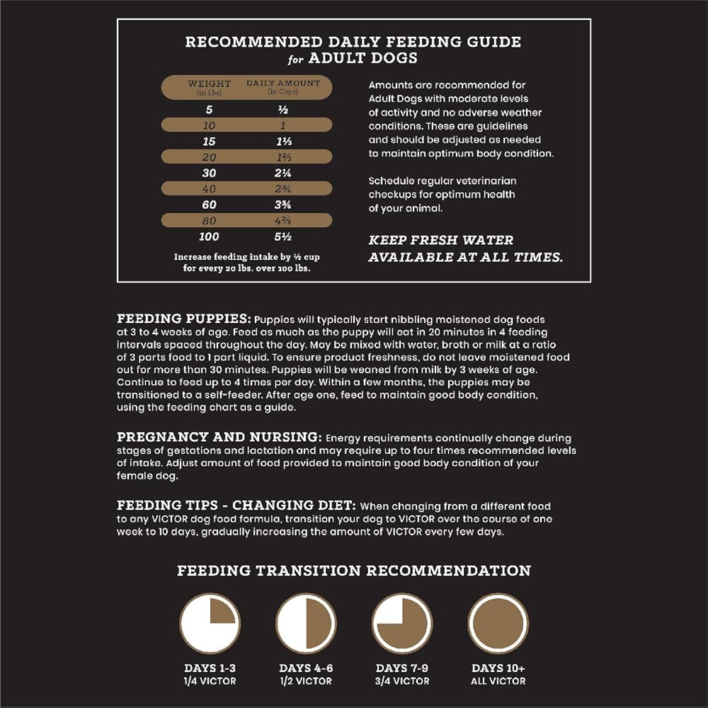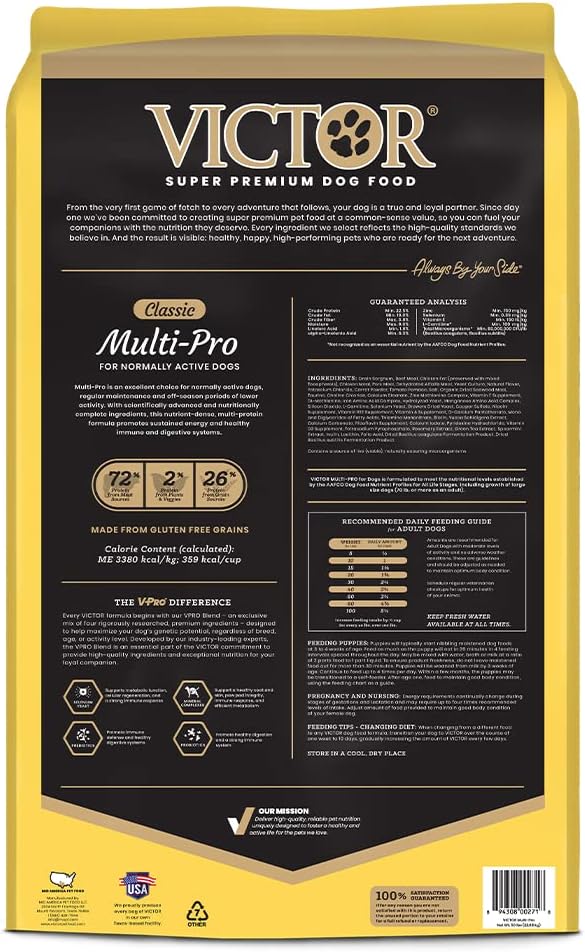 CLASSIC – MULTI-PRO: This super premium dog food is an excellent choice for normally active dogs, regular maintenance and off-season nutrition during periods of lower activity. This nutrient-dense dry dog food contains high-quality beef, chicken and pork meals and the gluten free kibble is fortified with vitamins, minerals, essential fatty acids, protein and amino acids, and promotes healthy immune and digestive systems, while supporting a healthy skin and coat. This professional dog food is a dry kibble with 22.5% protein and 10% fat, and is 3380 KCAL/KG or 359 KCAL/CUP. The protein in this nutrient-rich dog food comes from premium-quality meat sources (72%), plants and veggies (2%), and gluten free grain sources (26%). VICTOR Multi-Pro is part of our CLASSIC line of dog foods which is uniquely balanced for active dogs. With scientifically advanced and nutritionally complete ingredients, this nutrient-dense, multi-protein high quality dog food is suitable for all life stages and normal activity levels. We proudly produce every bag of VICTOR super premium dry dog food in our own Texas-based facility, and each ingredient used is carefully selected and serves a nutritional purpose. A majority of the ingredients in our dog kibble comes from ranches, farms and other trusted suppliers who are within a day's drive of our plant. Every VICTOR dog kibble formula is created with our proven VPRO Blend of ingredients – an exclusive mix designed by industry-leading experts to support superior digestibility, strong immune system function, and healthy skin and coat for every dog, regardless of breed, age, or activity level. And the result is visible: healthy, happy pets who are ready for the next adventure.