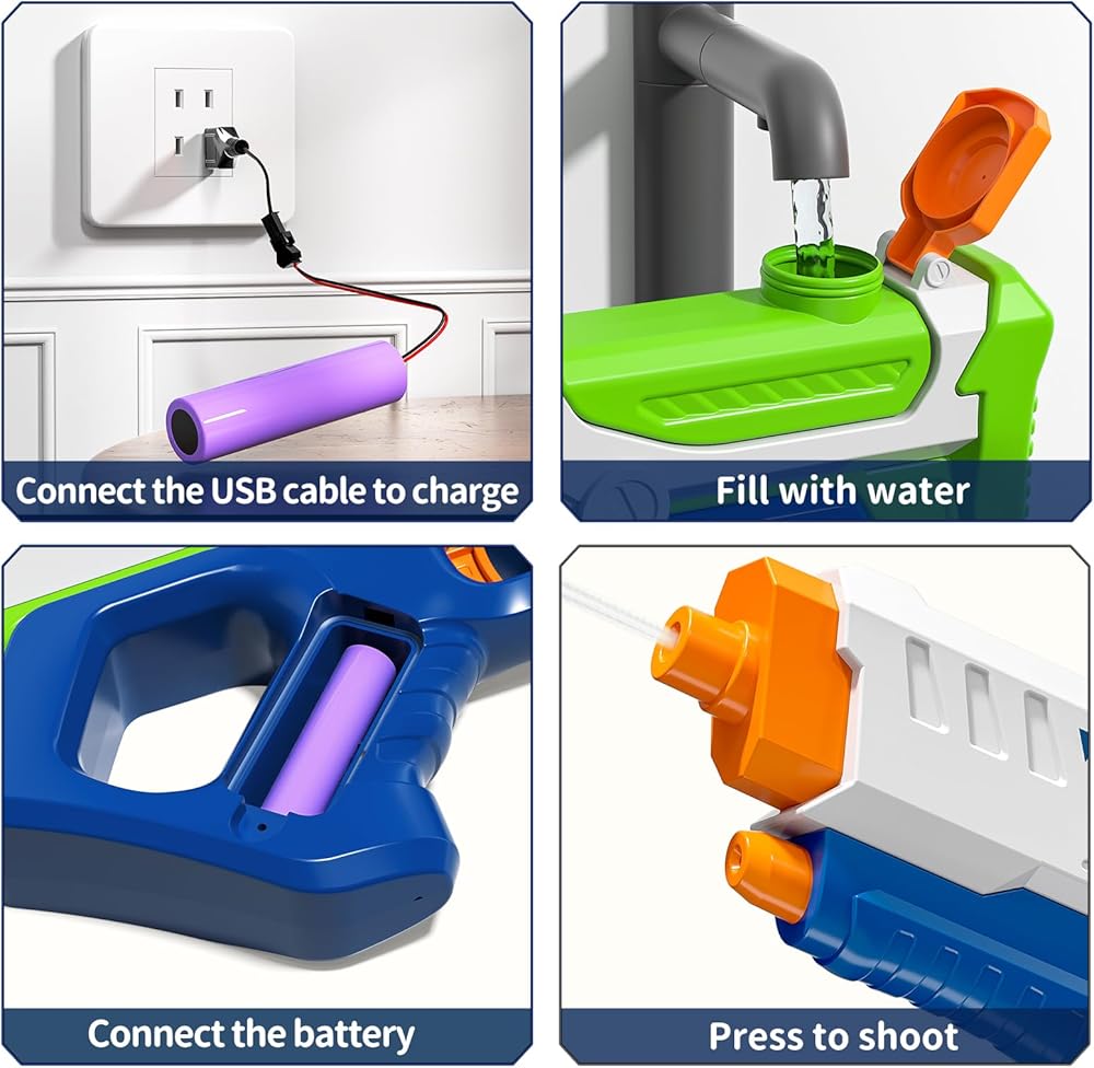 Battery Powered Water Gun - With a USB charging cable and rechargeable Li battery, it is easy to charge by a USB charger , power bank or computer , and leak- proof design for the battery compartment.
