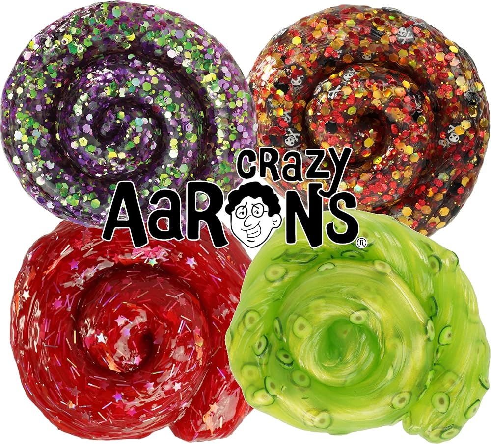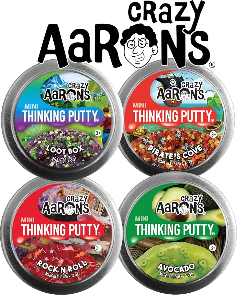 Crazy Aaron's Putty Mini Tins Loot Box, Rock N' Roll, Pirate's Cove & Avocado Gift Set Bundle - 4 Pack (13.3g each) is AWESOME! This is an amazing sample set of 4 (2 Inch, .47oz) Mini Tins from Crazy Aaron! This set is ideal for party favors, special needs, stocking stuffers, schools and so much more! Loot Box - This glitter treasure chest will reward you with green and purple sparkle. Unlock this tin to get your putty game on! Rock N' Roll - Dig in rock OUT! Crank it all the way up, and rock till ya drop with this classic jam. Pirate's Cove - Blimey! This putty is chock full o' skulls for matey's seeking adventure. Explore at your own risk! Avocado - Avocados are always a good idea. And this putty, filled with teeny avo-cuties, is about to guac your world! Helps build hand and finger strength through a fabulous tactile play experience with unique, unexpected properties and provides relaxing, yet stimulating interaction for anyone with sensory integration issues. For ages 3 and up - Made in the USA - Makes a Great Gift!