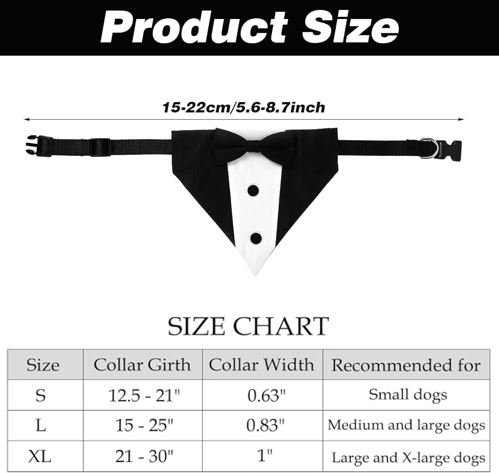 Adjustable size】This dog collar with a bow is equipped with an adjustable collar, and the length of the large-sized tie is 23.62 inches/60 cm. We recommend that your pet's neck size be between 17 inches and 23 inches. Before ordering a dog wedding tailcoat, please refer to the size guide and measure your dog's neck circumference.