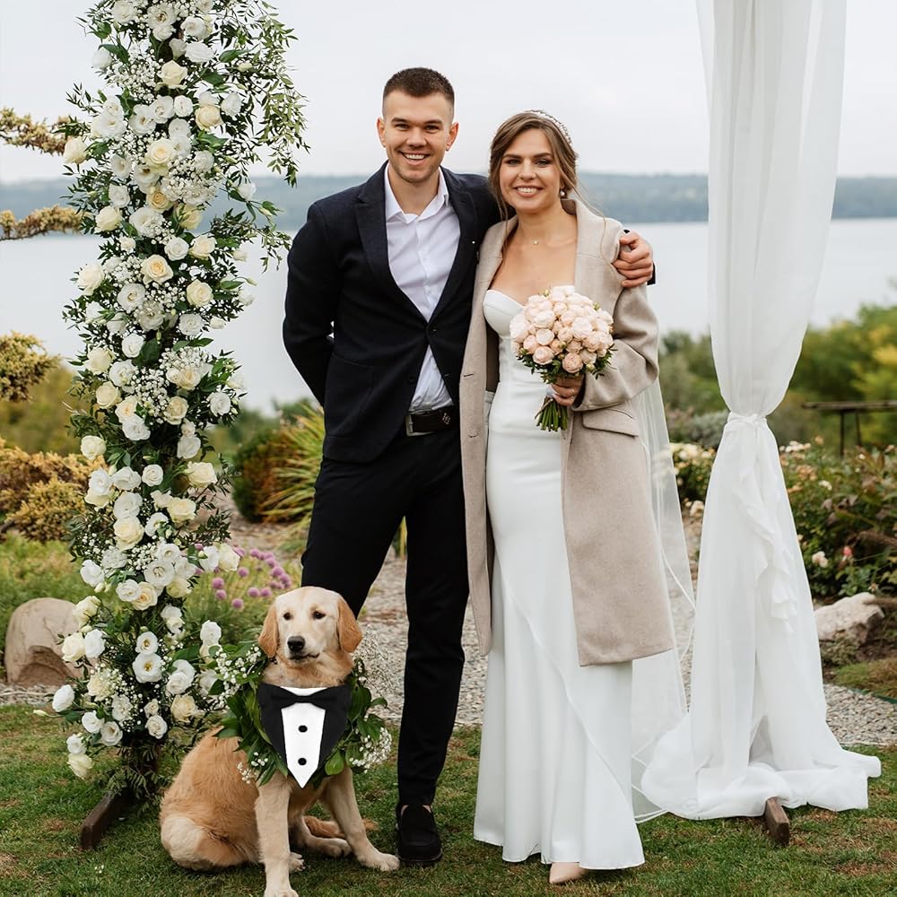 【Dog Wedding Dress】The dog wedding outfit features a tailcoat style headscarf and an elegant bow tie. It is perfect for weddings, engagements, bridal showers, Valentine's Day, birthday parties, and other formal events, making your beloved dog elegant and charming.