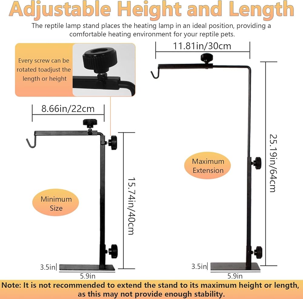 💡 الارتفاع والطول القابل للضغط: يمكن ضبط حامل مصباح أرضية الزواحف لتلبية احتياجاتك بناءً على حجم خزانك. النطاق القابل للتعديل هو 40-64 سم/15.74-25.19 بوصة في الطول و 22-30 سم/8.66-11.81 بوصة. تقاس القاعدة 5.9x3.54 بوصة.