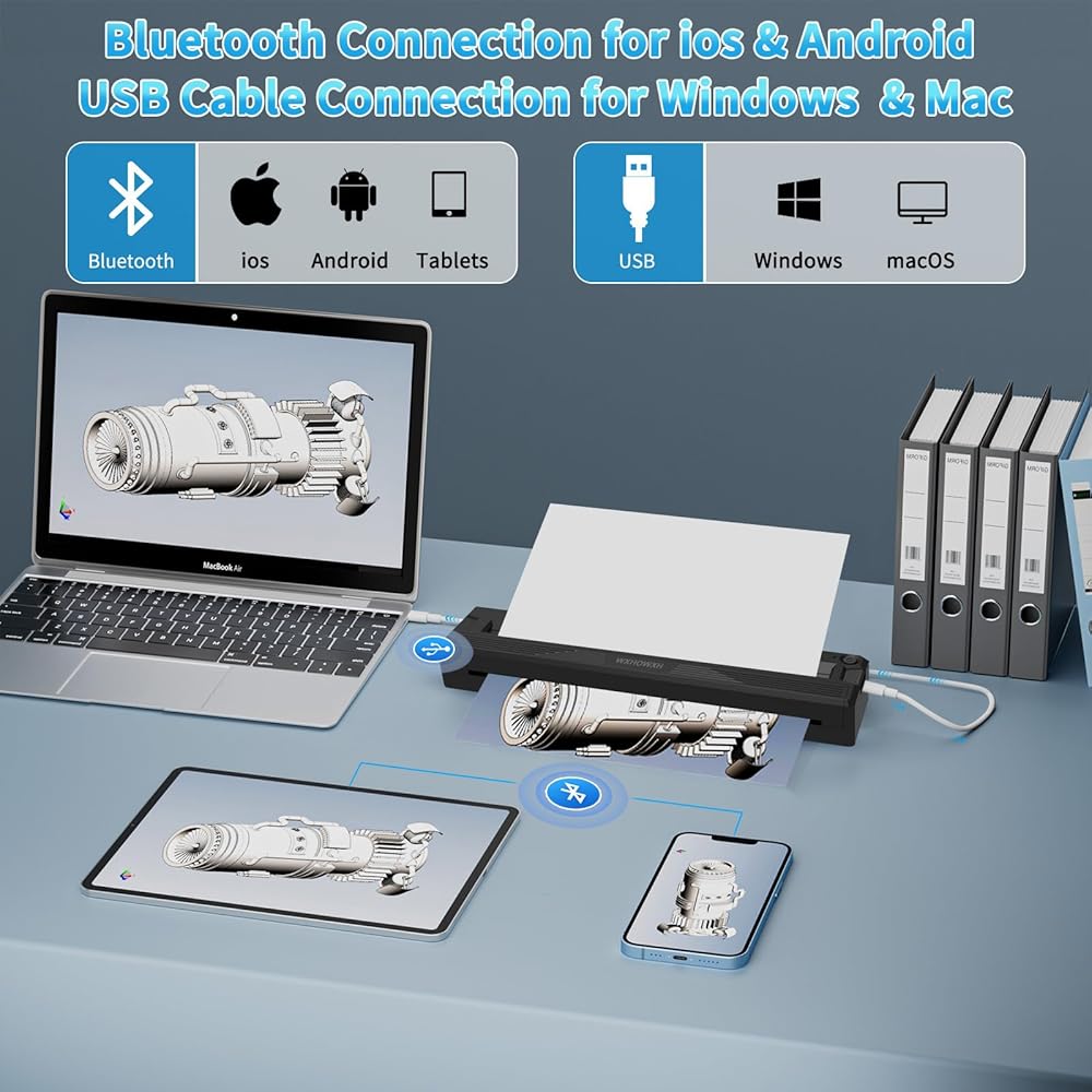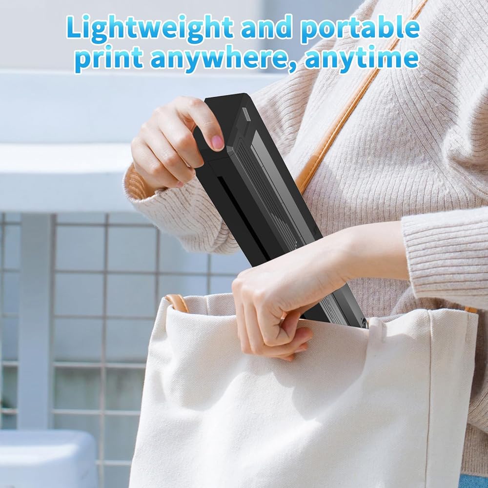 طابعات محمولة لاسلكية للسفر، طابعة صغيرة بدون حبر تعمل بتقنية البلوتوث الحرارية 300 نقطة في البوصة متوافقة مع أجهزة Android وiOS والكمبيوتر المحمول، تدعم الحروف الأمريكية مقاس 8.5 بوصة × 11 بوصة، طابعة سفر متنقلة صغيرة محمولة للمنزل