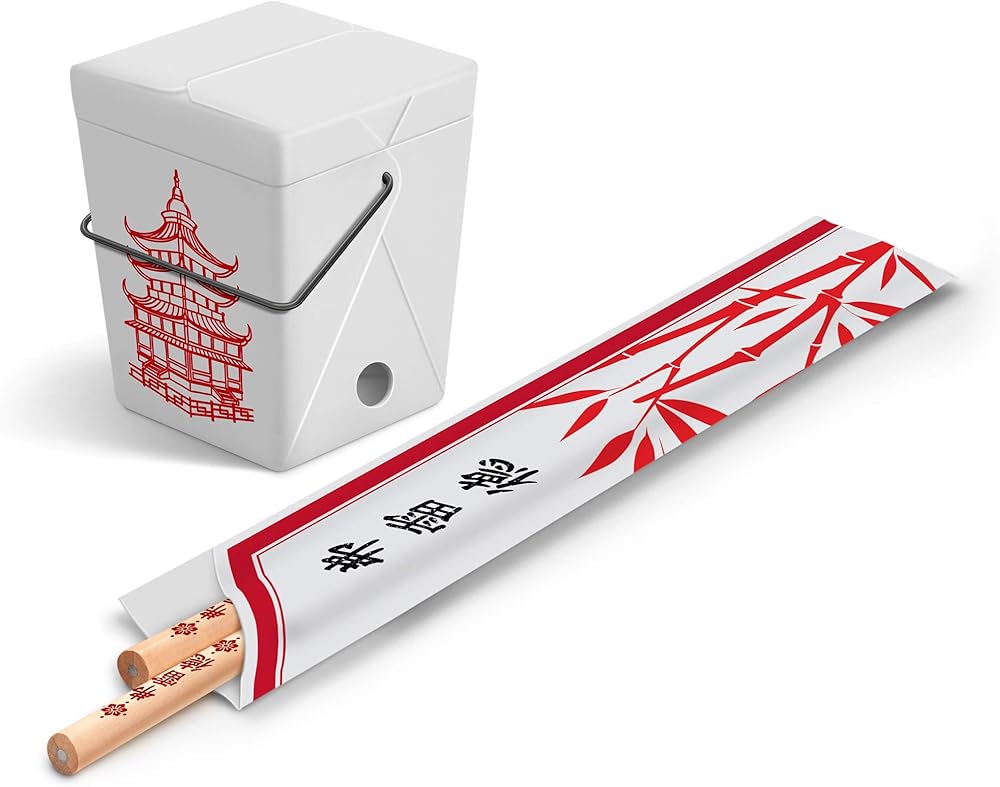 UNIQUE DESIGN: Tso Sharp is the desk accessory that you've been craving! This unique set comes with two wooden “chopstick” pencils and a take out container pencil sharpener.
