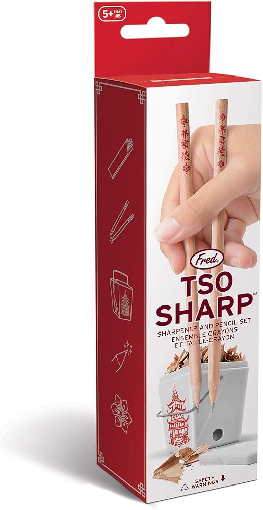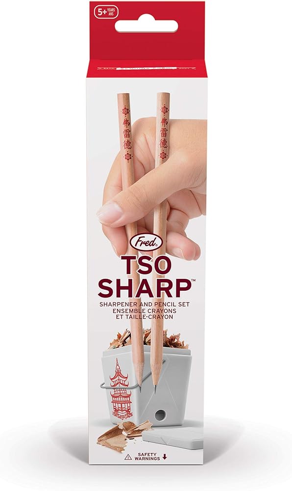 "Genuine Fred's Tso Sharp is the charming desk set that you've been craving! This unique set comes with two wooden “chopstick” pencils and a sharpener modeled after the classic take out container. What more could you wonton? Packed in a colorful, peggable gift box.Auténtico Fred's Tso Sharp es el encantador juego de escritorio que has estado anhelando. Este juego único viene con dos lápices de madera "palillo" y un sacapuntas modelado después del clásico recipiente sacar. Qué más podrías ganar? Empaquetado en una caja de regalo colorida y peggable."