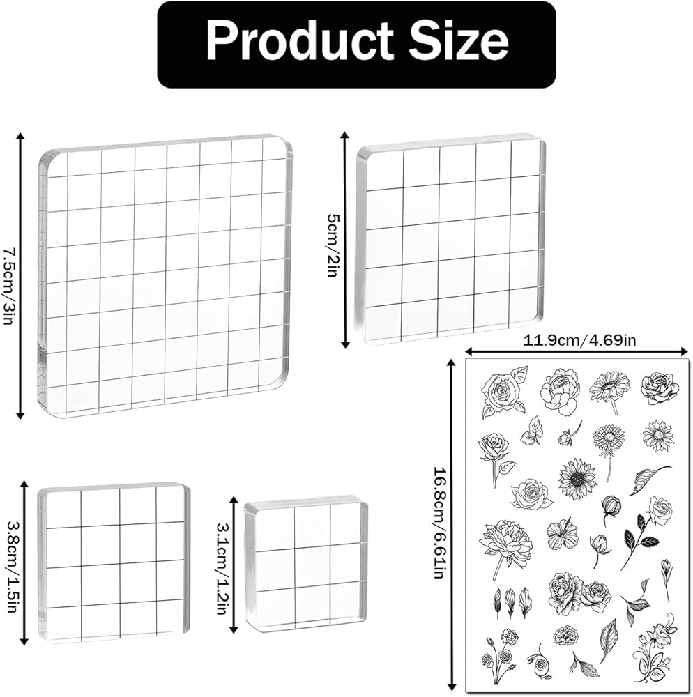 【4 Different sizes】Acrylic Stamp Block size 3.1 x 3.1 x 1 cm, 3.8 x 3.8 x 1 cm, 5 x 5 x 1 cm, 7.5 x 7.5 x 1 cm peel off the protective film from both sides of the stamping blocks before stamping.