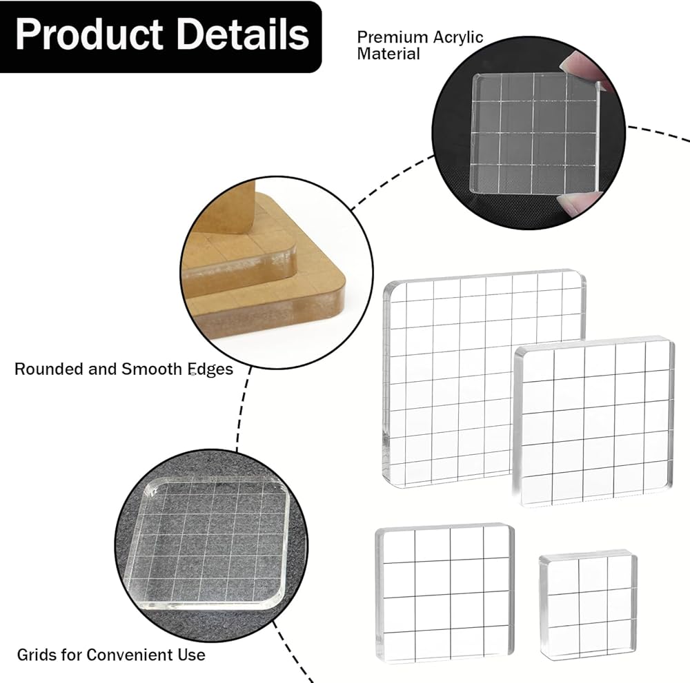 【You will get】4pcs Stamping Blocks with Grid Lines, There are 4 sizes of squares acrylic stamp blocks and 0.4 inches thick. They are good for various DIY crafts, such as card making, journaling, scrapbooking, stamping, Christmas cards, thank-you cards, gift tags, clipboards.