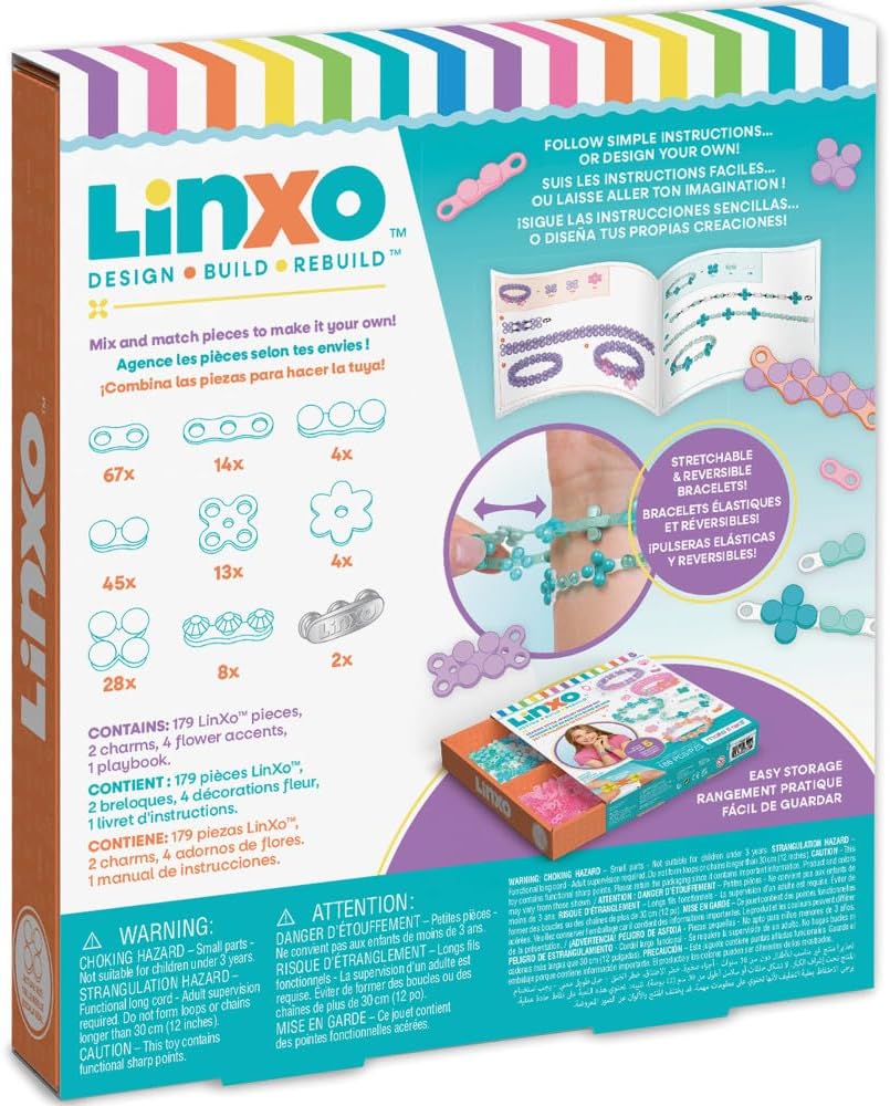 MIR: LINXO: SEASIDE JEWELRY DESIGN SET Build five flexible and stylish LinXo bracelets, then rebuild for endless creativity! LinXo is a construction system that allows kids to design and assemble their own unique creations using flexible and connectable pieces, then take them apart to build and rebuild again! This set contains everything tweens need to assemble their own seaside-inspired jewelry by connecting the links, decorating with flower accents, then wearing in style. Freestyle creations, or use the included easy-to-follow playbook with instructions illustrated to full scale. When not in use, easily store the pieces in the cleverly designed packaging for the next time creativity strikes. This set makes a great gift idea for tweens, whether for a birthday bash, holiday, or just because! Perfect for ages 6+. Collect all three themed sets! The LinXo Seaside Jewelry Design Set offers a stimulating and creative play experience where children can build, customize, and wear their own unique jewelry inspired by the seaside, fostering creativity, exploration, and artistic expression.