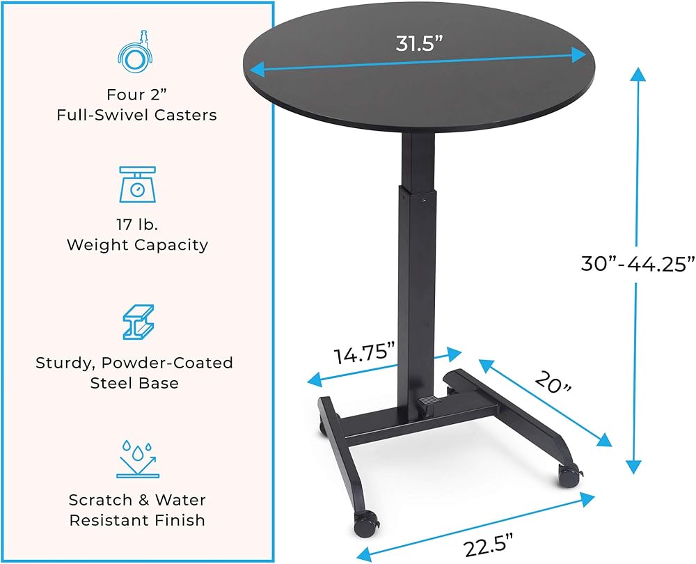 • الارتفاع قابل للتعديل: الهوائية ، أشبه بالهواء المضغوط. يسمح المصعد الهوائي بمساعدة الهواء هذه المائدة المستديرة بالانتقال بهدوء من الجلوس إلى ارتفاع الوقوف في ثوانٍ. ارفع سطح المكتب المسطح من 30 بوصة إلى 44 بوصة