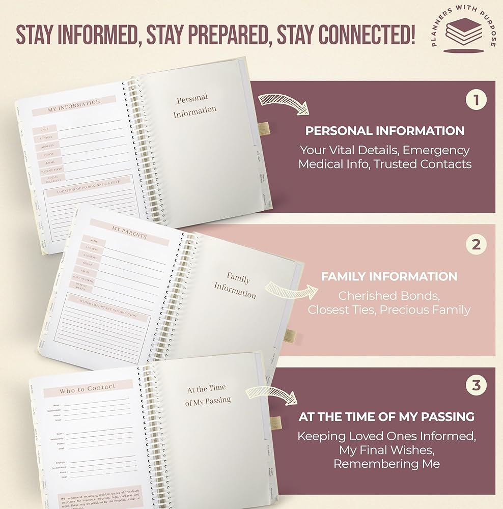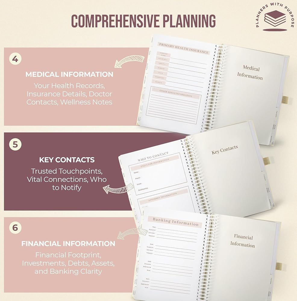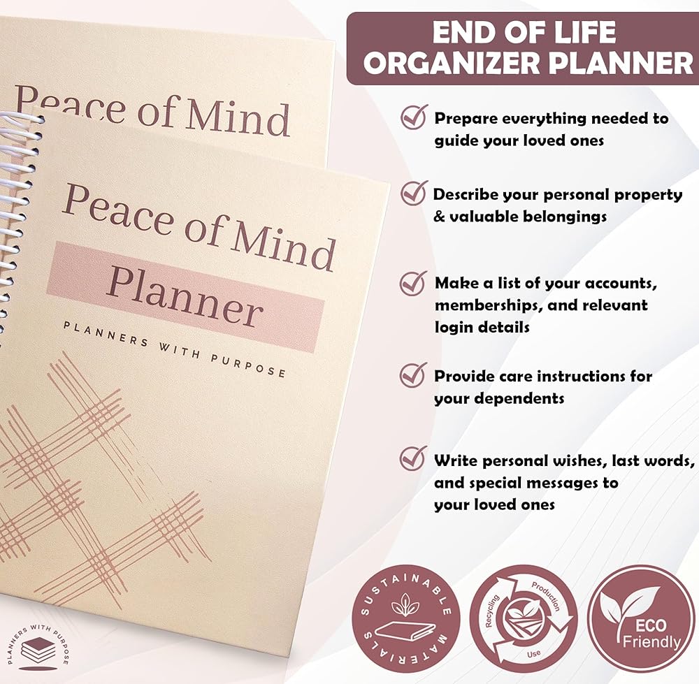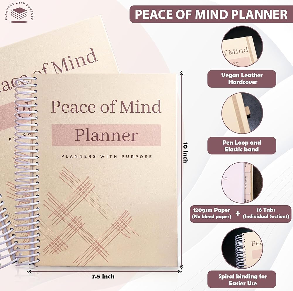 خطط مع راحة البال: تم تصميم مخطط راحة البال لمساعدتك أنت وأحبائك في البقاء منظمة في الأوقات الصعبة. مع 16 قسمًا منظمًا ، فإنه يوفر طريقة بسيطة وفعالة لتسجيل تفاصيل الترتيب الشخصية والمالية والنهائية الحيوية ، مما يضمن عدم تجاهل أي شيء.