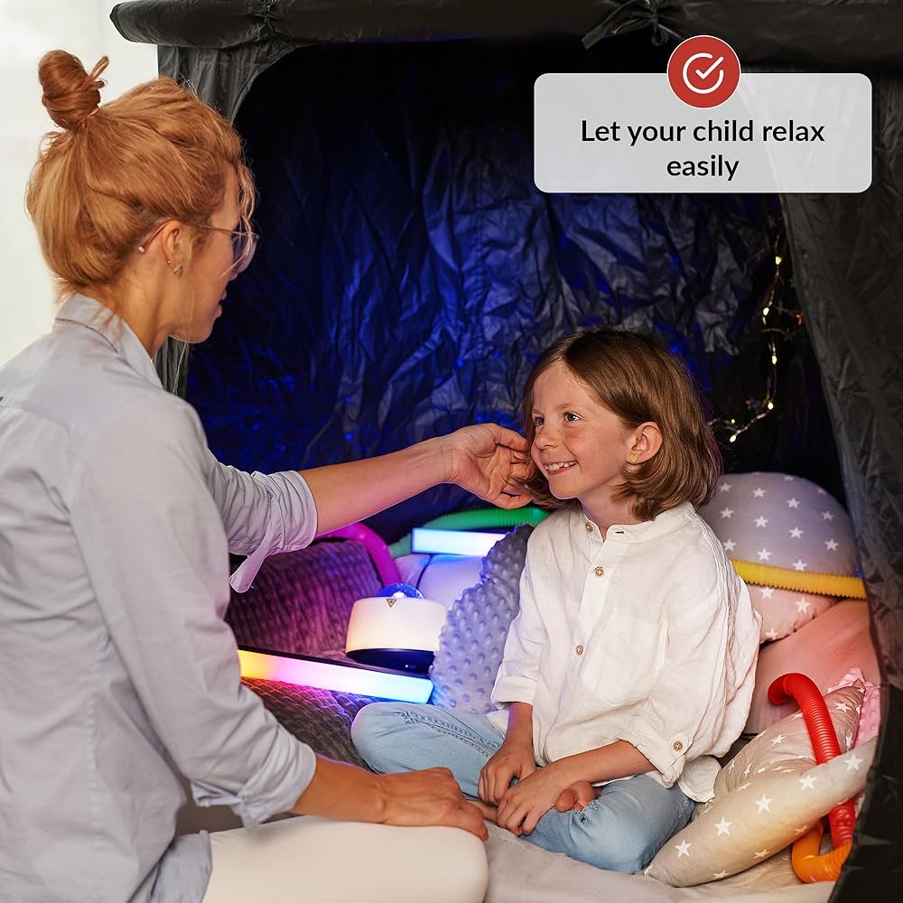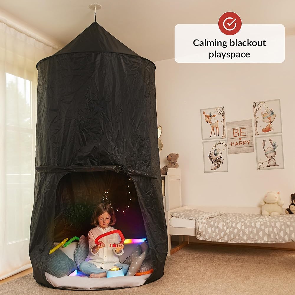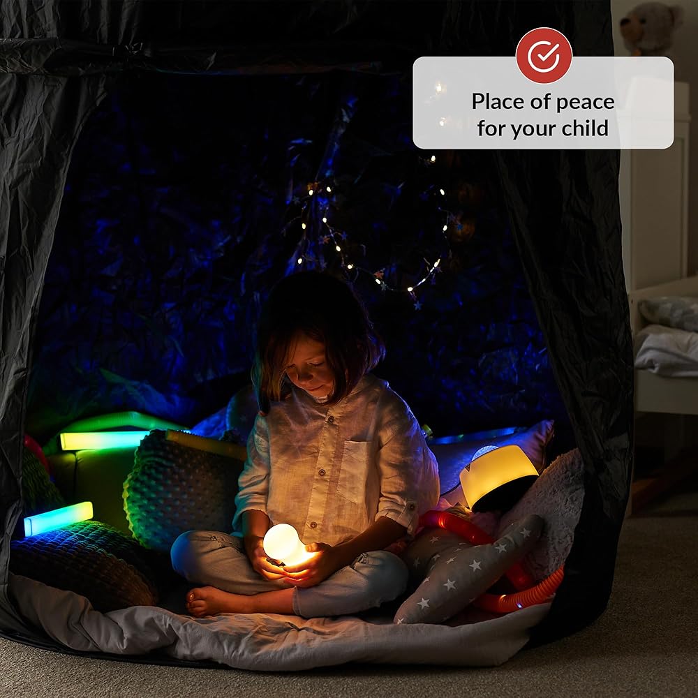 مساحة هادئة لطفلك - قم بإنشاء زاوية حسية مريحة ومهدئة لطفلك حيث يمكن أن يأخذوا استراحة من العالم المزدحم واللعب في وتيرته. هذه الخيمة الهادئة مثالية للأطفال ذوي الاحتياجات الخاصة الذين يتم المبالغة في المبالغة في التحفيز ويحتاجون إلى بيئة آمنة للاسترخاء في المنزل أو في المدرسة.