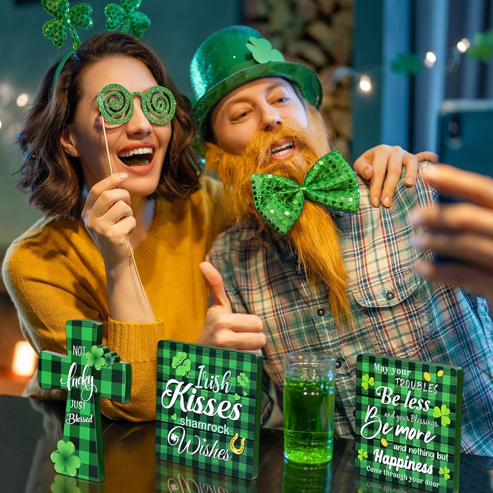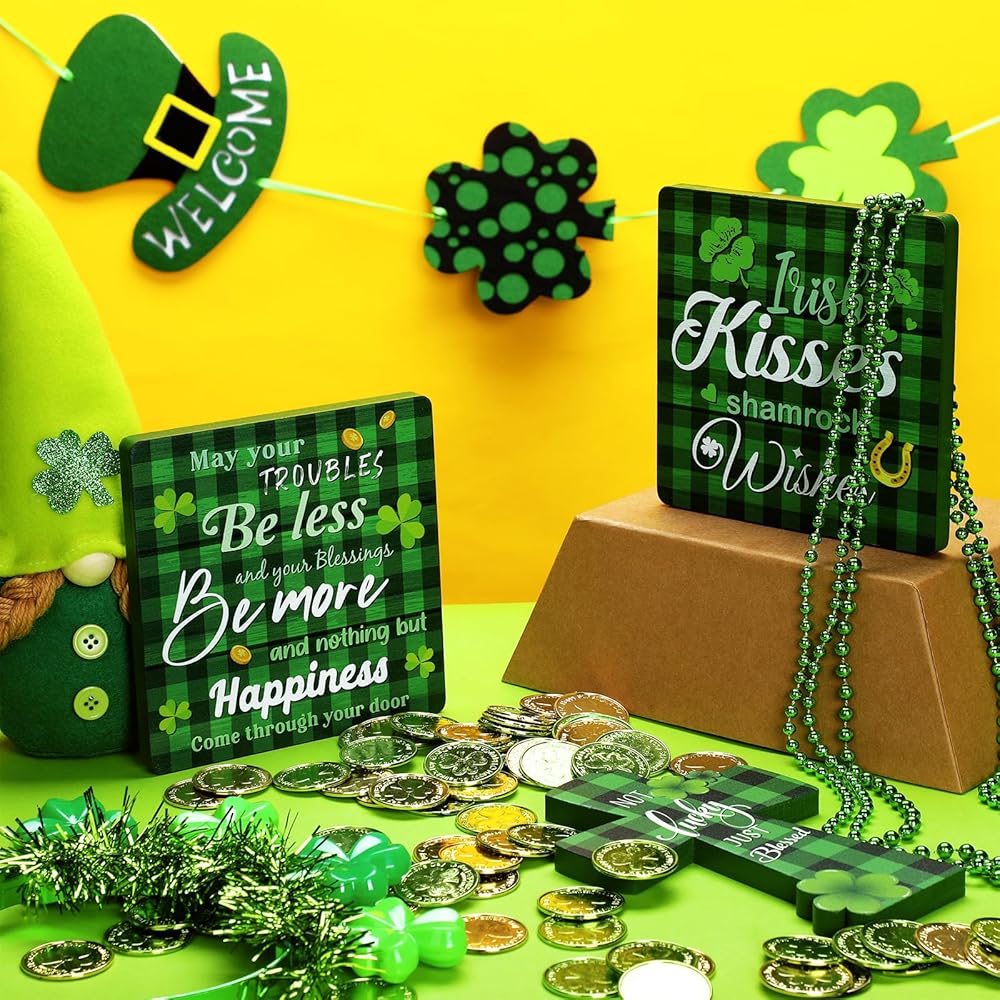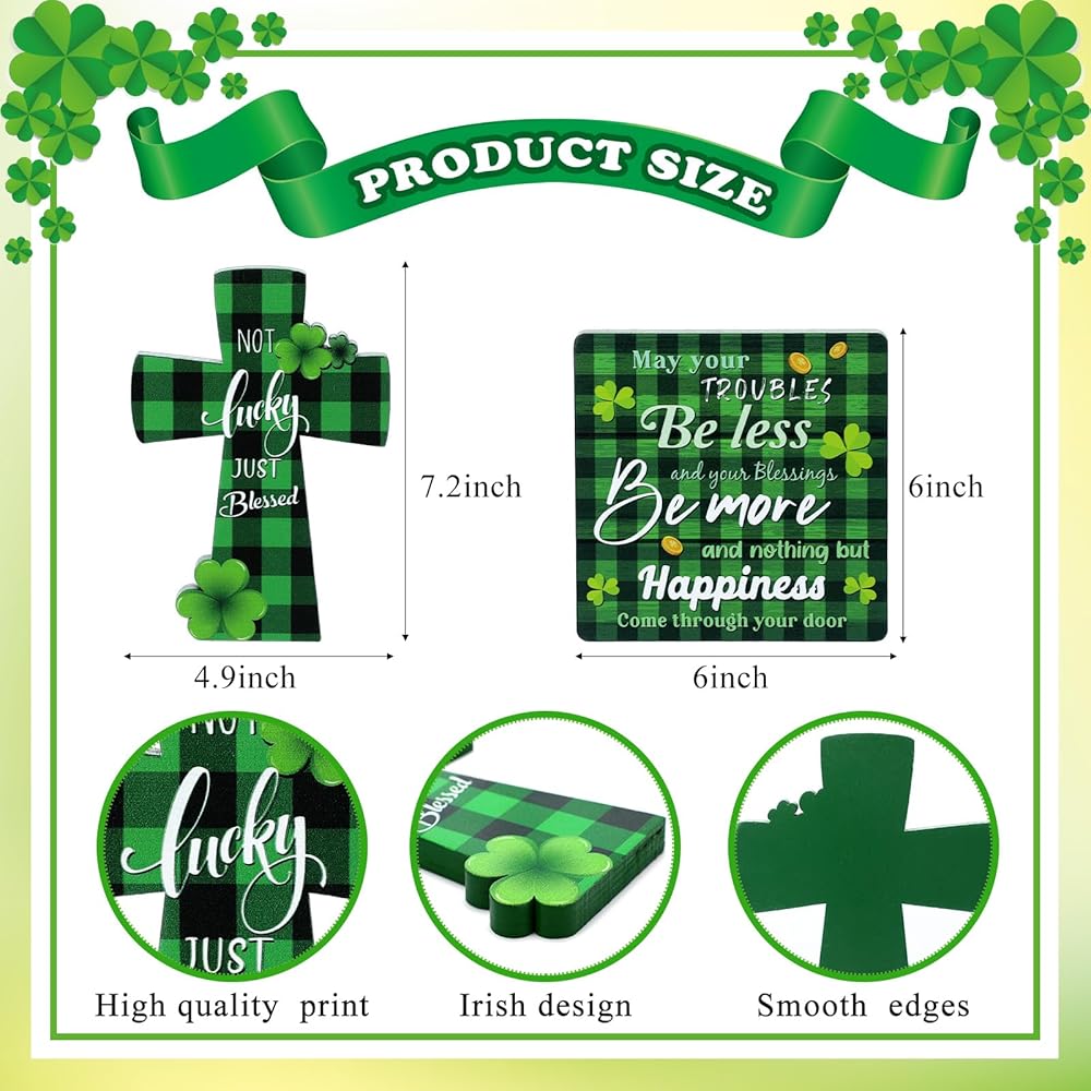 St. Patrick's Day Plaque Set: the package contains 3 pieces of buffalo check St. Patrick's Day table centerpieces, including buffalo plaid cross tabletop approx. 4.9 x 7.2 inches and the other 2 buffalo check plaid blessing tabletop approx. 6 x 6 inches, and are all about 0.5 inch in thickness