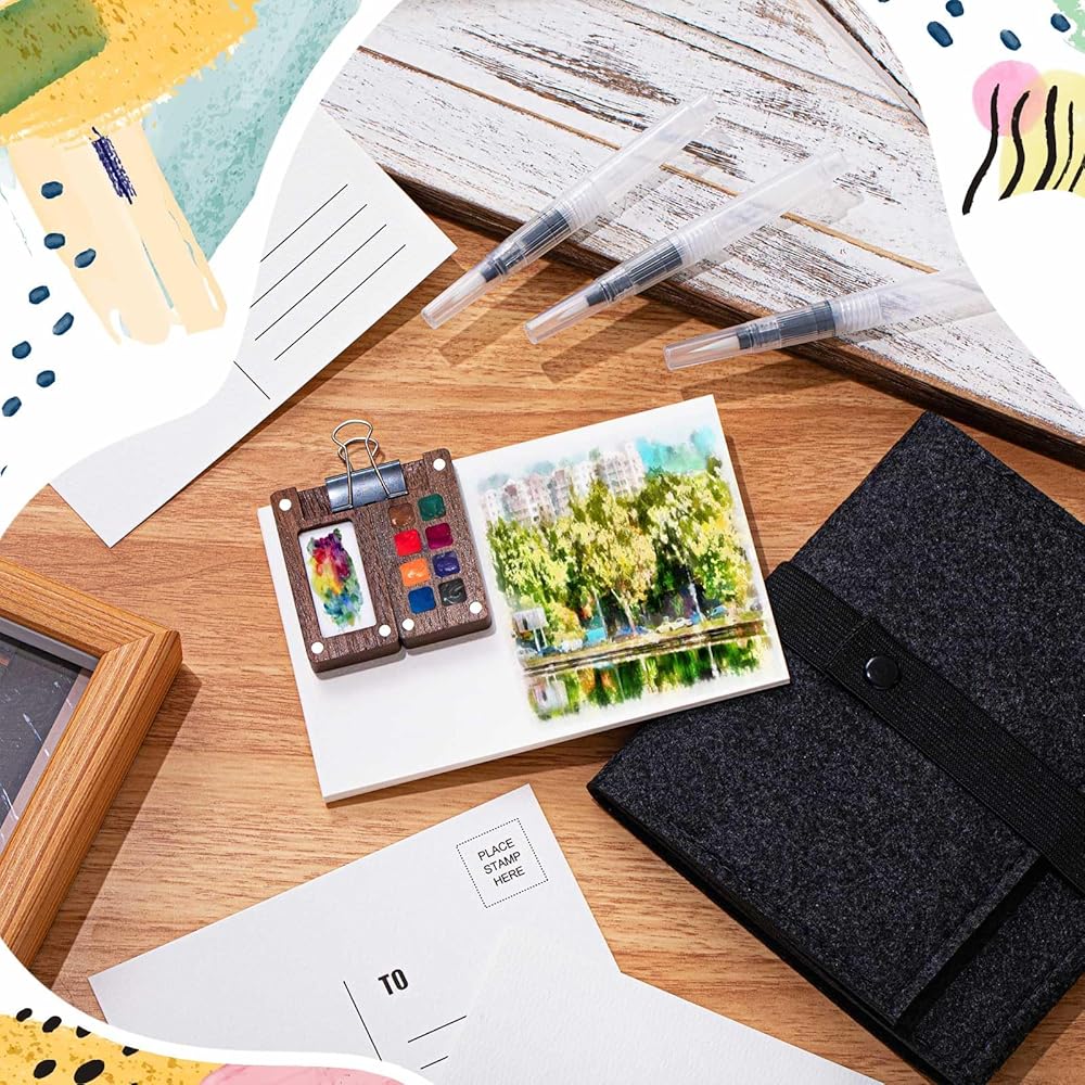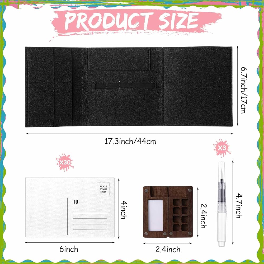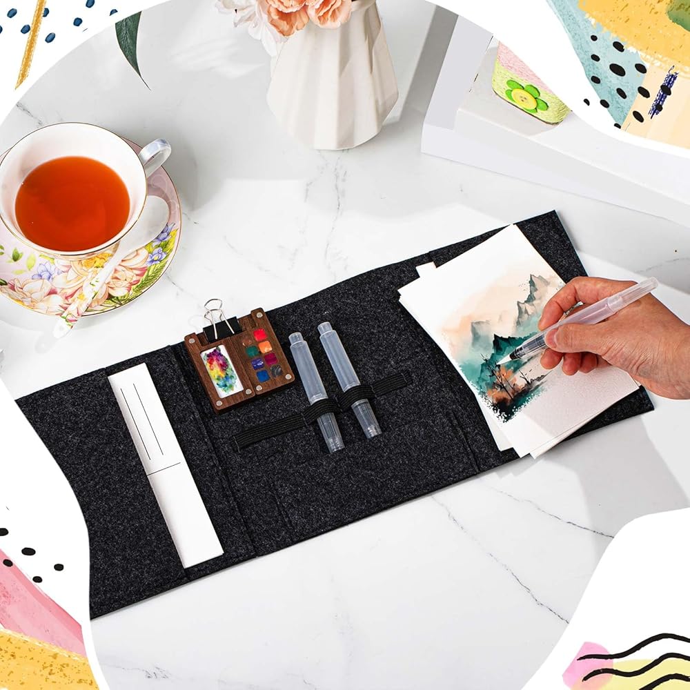 • Thoughtfully Designed Felt Bag: our felt bag of the watercolor travel set is designed with separate pockets to secure your finished postcards and stamps, preventing harm to your artsy creations; Enveloped in a soft, quality felt exterior, it proves to be more than just a carrier but a protective parcel for your artistic treasures