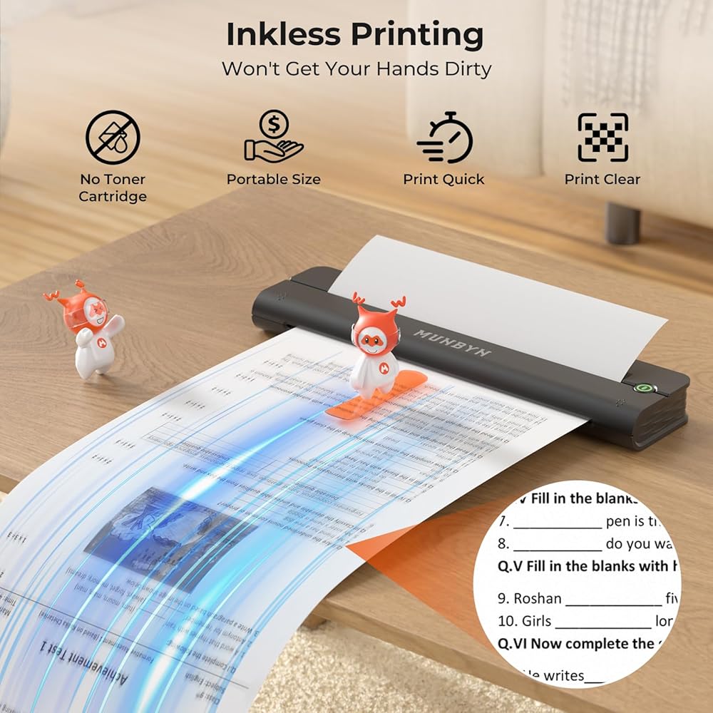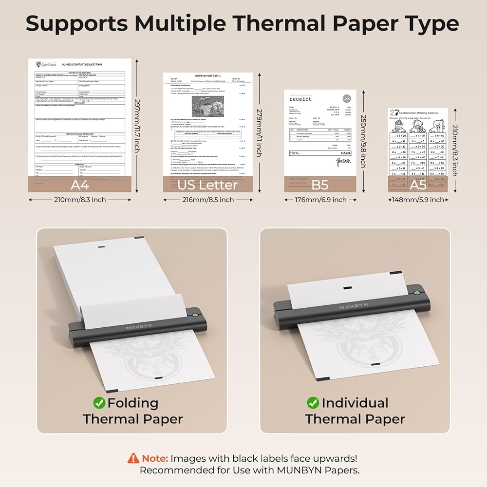 الطباعة غير الخاضعة للطباعة: تستخدم طابعة Munbyn الحرارية التكنولوجيا الحرارية ، لذلك ليست هناك حاجة للحبر أو الحبر أو الأشرطة. هذا لا يزيل فقط انسداد الحبر ومتاعب التنظيف ولكنه يجعله أيضًا خيارًا صديقًا للبيئة. من المهم أن نلاحظ أن الطابعات الحرارية تدعم بشكل حصري الورق الحراري ، بدلاً من الورق العادي. يمكن أن تدعم طابعة Inkless Letter/A5/B5 الورق الحراري. بالإضافة إلى ذلك ، فإنه يدعم الطباعة بالأبيض والأسود فقط.