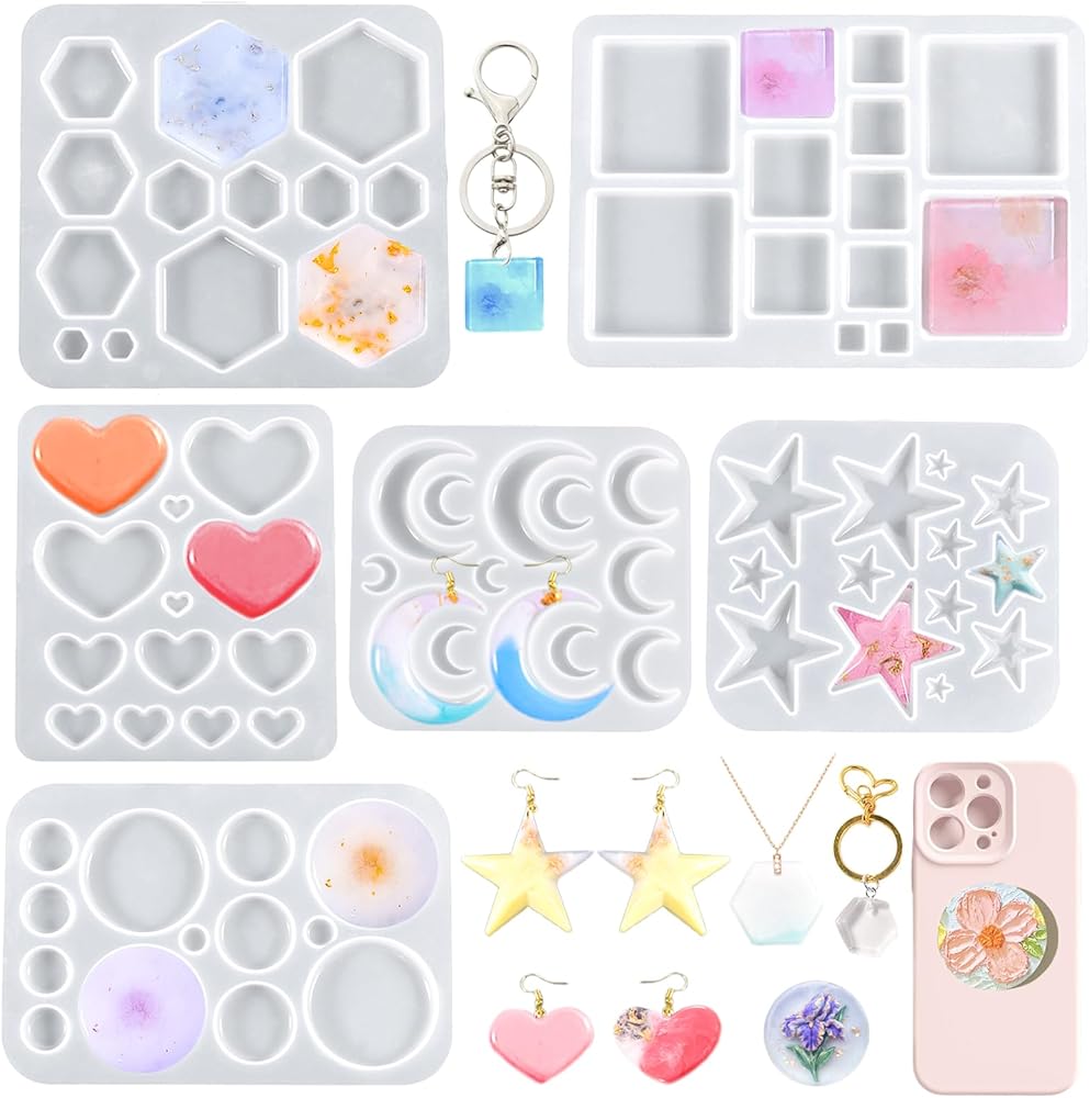 6 PCS Resin Jewelry Molds Multi-Functional Small Silicone Earring Resin Molds for Hexagon Round Crescent Moon Pentagram Heart Square Molds for Keychain Pendant Necklace Charm Earrings Jewelry Making