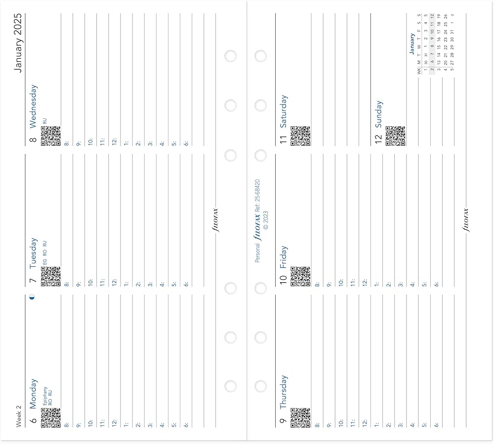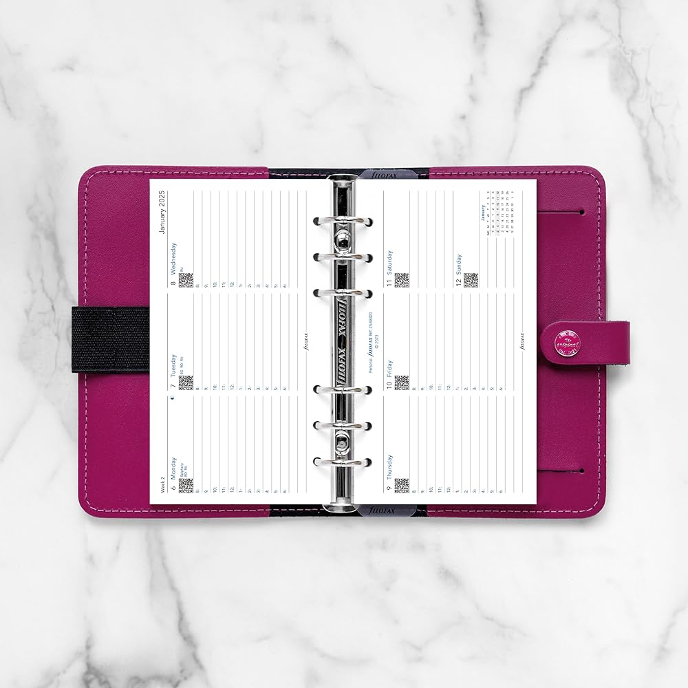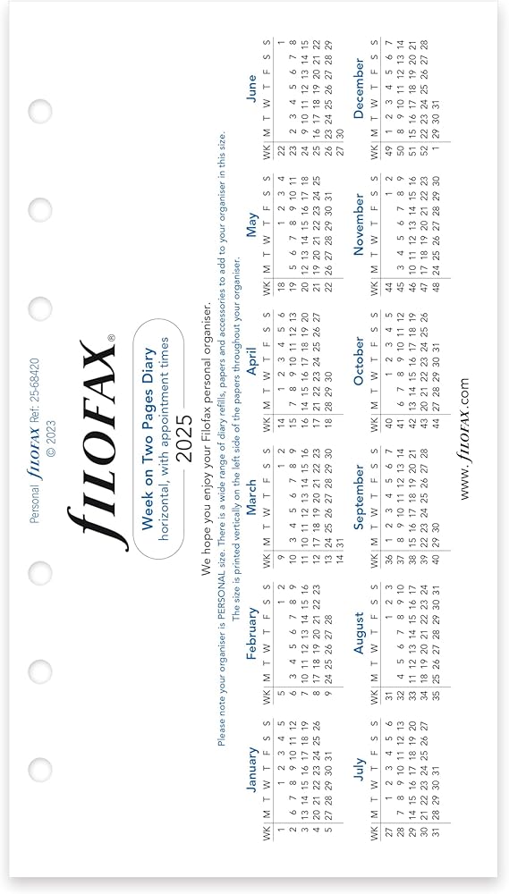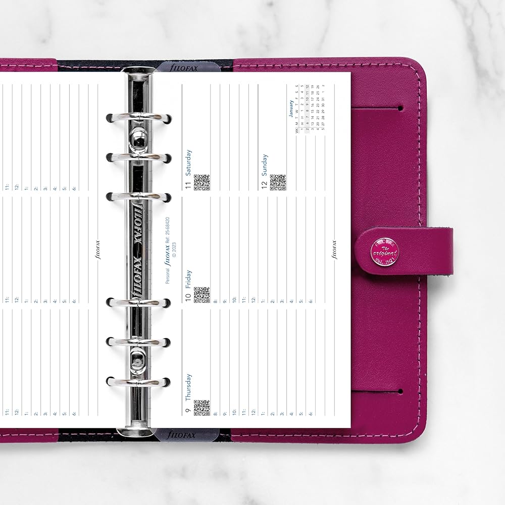 Organize the week's appointments at a glance with this personal/personal compact week on two page diary. Calendar Diary Refill features: Week-to-View (WTV), Week on two pages with appointments, January to December, 2025. Weekday hourly appointment schedule from 8:00 a.m. to 6:00 p.m. Ruled, white 80 gsm fountain pen-friendly paper. 64 sheets printed with black and blue ink. Horizontal layout. Weekly dated refill is personal/personal compact size for planners, organizers, agendas and diaries. English. The future of planning is here. Plan, scan, click and go with Filofax® Organizers featuring Plan & Link™. Download the free Filofax® Reminder app, powered by InkLink™ technology, from the App Store and Google Play. Over the years, the Filofax organizer has evolved from a simple loose-leaf system into an indispensable everyday accessory. The Filofax logo promises authenticity and the finest craftsmanship. It's a hallmark of impeccable quality, trusted worldwide, since 1921.