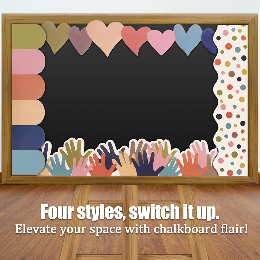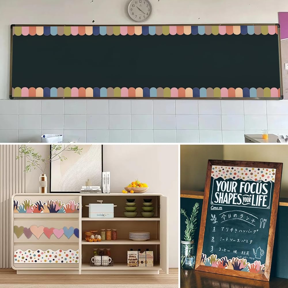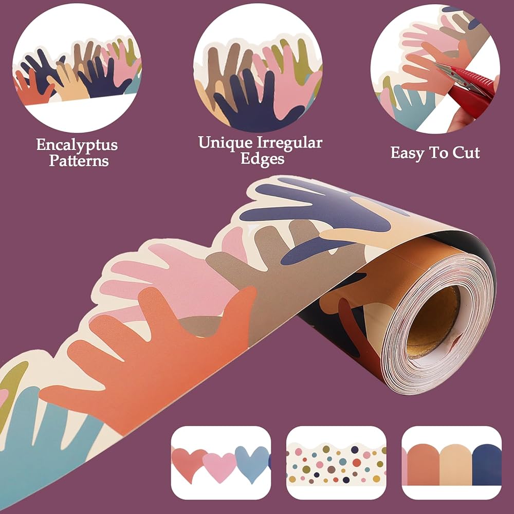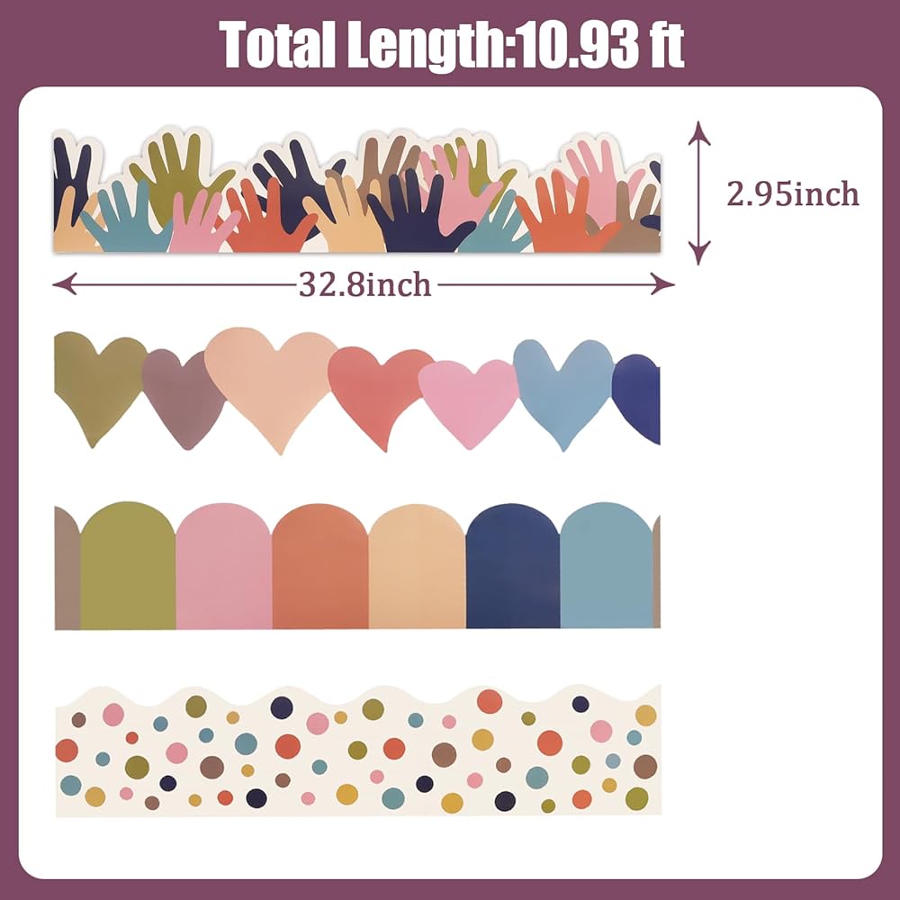 The product offer 4 rolls of Bohemian bulletin board borders, each with a width of 2.95 inches and a length of 32.8 feet, totaling 131.2 feet of decorative length. Including colorful hearts, hands, patchwork blocks, and dots in four different styles, these bulletin board borders add fun to your decorations. Simply cut the bulletin board border to the desired length and paste it in the required location for easy and convenient use. Made from premium paper, the bulletin board borders are thick and not prone to tearing or deforming. Suitable for adhering to various surfaces, including bulletin boards, blackboards, chalkboards, windows, desks, and lockers, these bulletin board borders are appropriate for classroom, office, and home decorations.