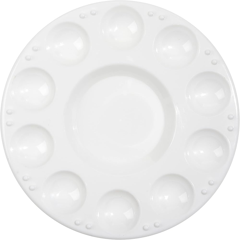Round palette paint tray includes 10 wells and a larger central well for mixing colors. High quality plastic construction, lightweight and easy to hold. 7 inch Diameter.