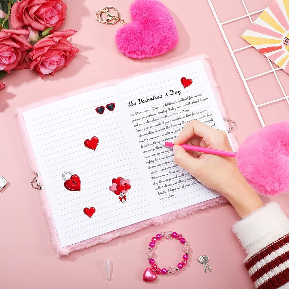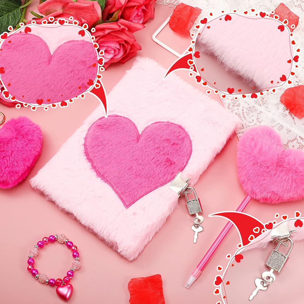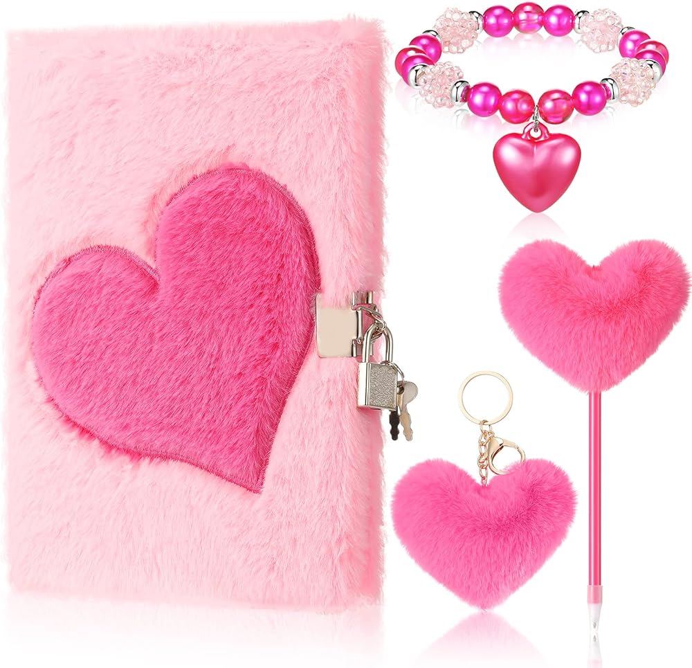 تشمل مجموعات هدايا مذكرات inbagi 4 PCS Plush Pink Girls Journal مع قفل ومفتاح ، سلاسل مفاتيح قلب رقيقة ، بوم بوم ، أساور مطرز للطلاب عودة إلى أصدقاء المدرسة